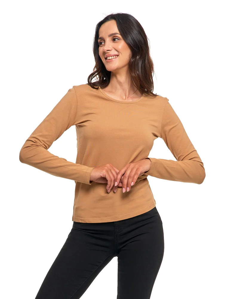 Bluzka damska z długim rękawem bawełniana gładka BEŻOWY