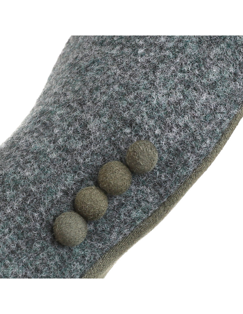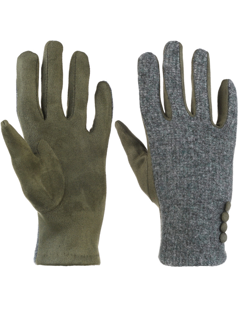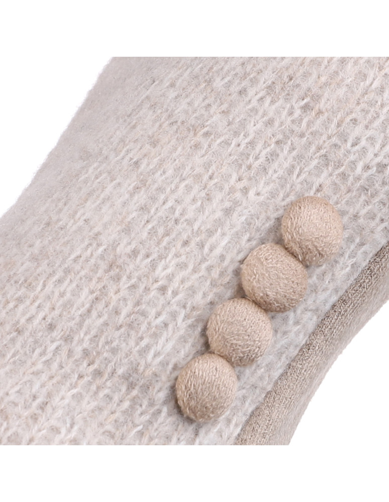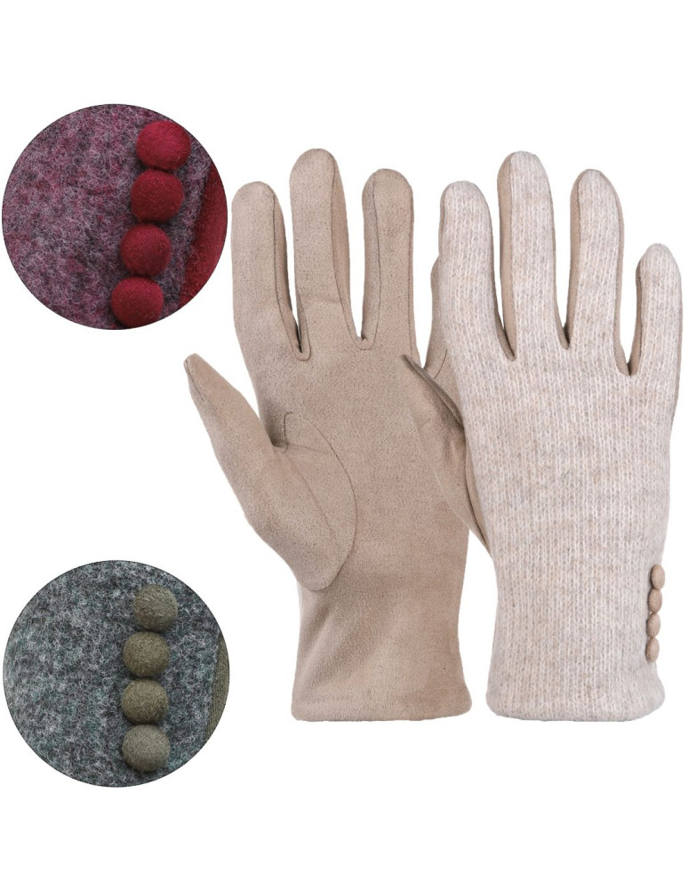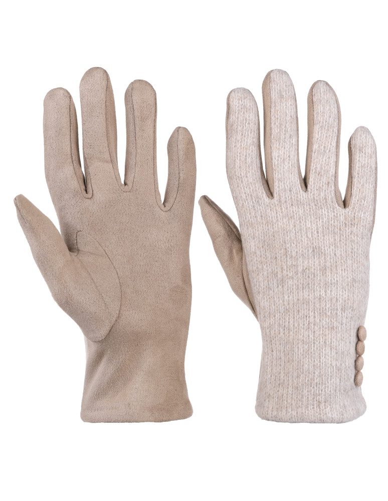 Zewnętrzna warstwa ma subtelną, dzianinową strukturę, którą uzupełniają stylowe guziki — dodające rękawiczkom uroku i klasy. Dzięki elastycznemu fasonowi doskonale dopasowują się do dłoni, zapewniając wygodę noszenia.