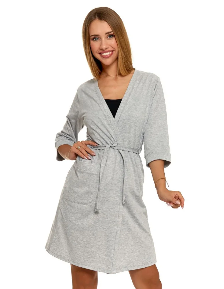 Szlafrok damski szary z kieszeniami wiązany na pasek JASNY SZARY