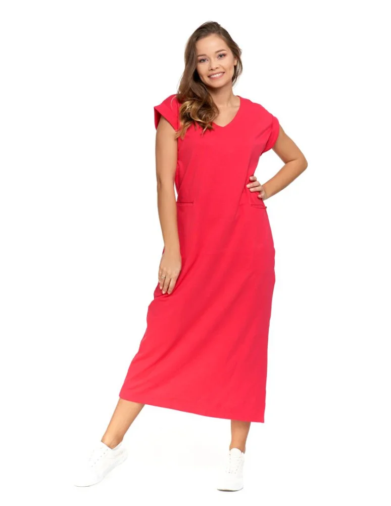 Długa sukienka damska bawełniana z rozcięciem na nodze MALINOWY