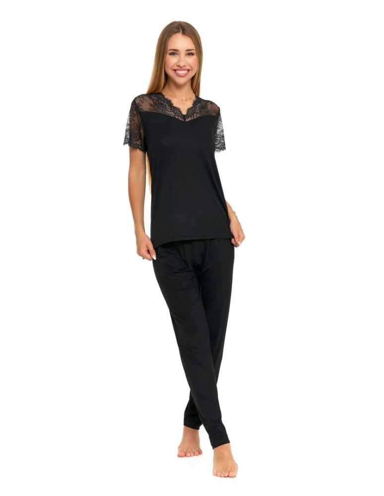 Czarna piżama damska wiskozowa z koronką i długimi spodniami CZARNY