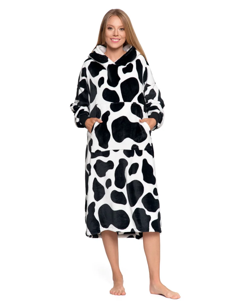Kocobluza ciepła z kapturem uniwersalna wzór w krowę CZARNY