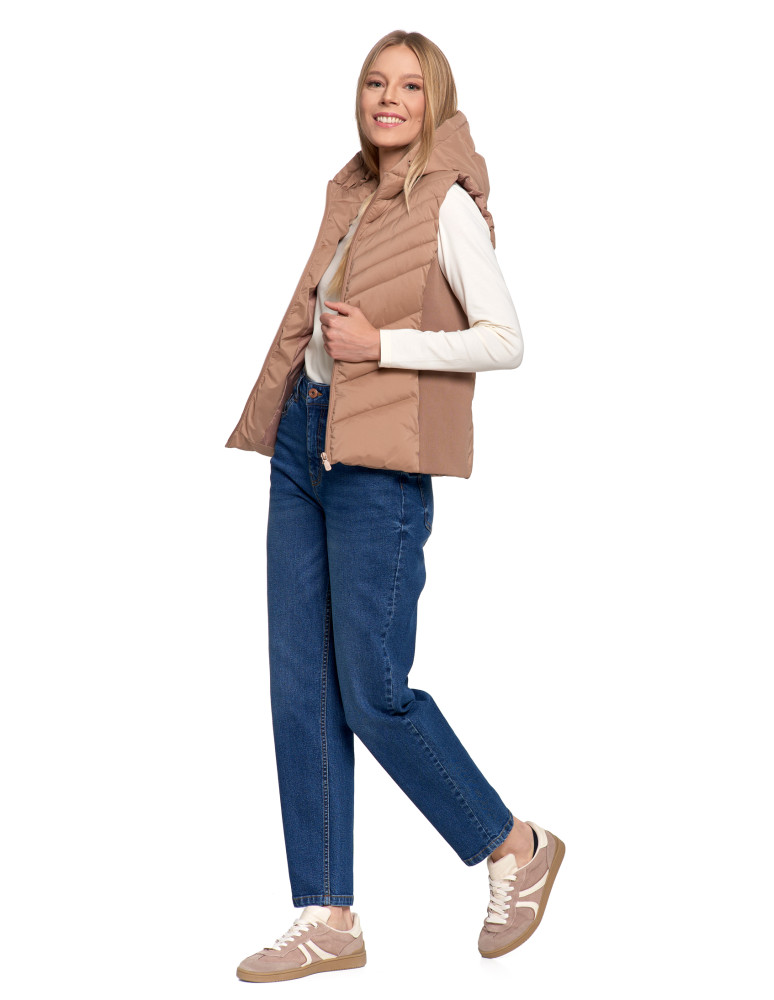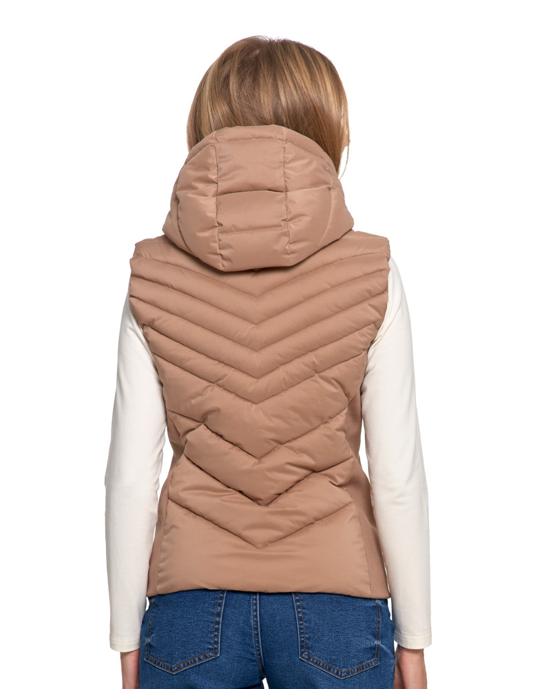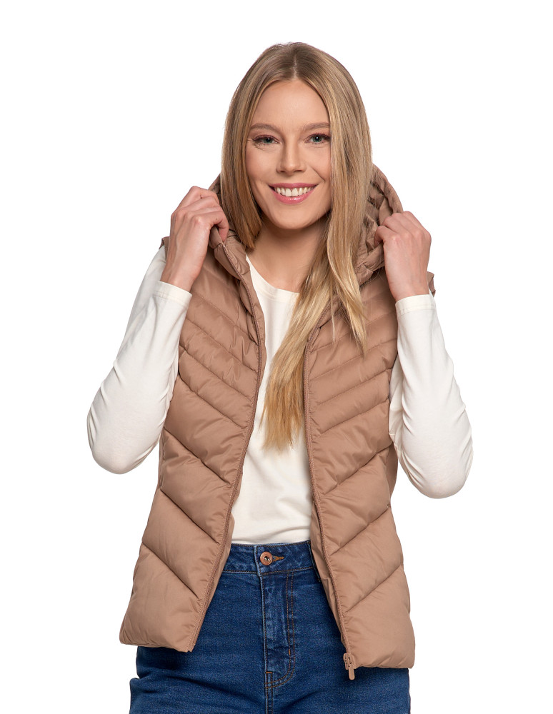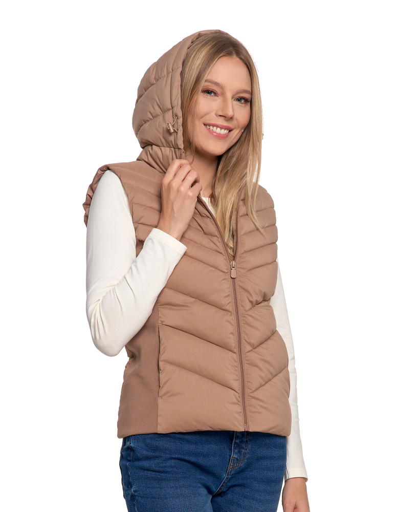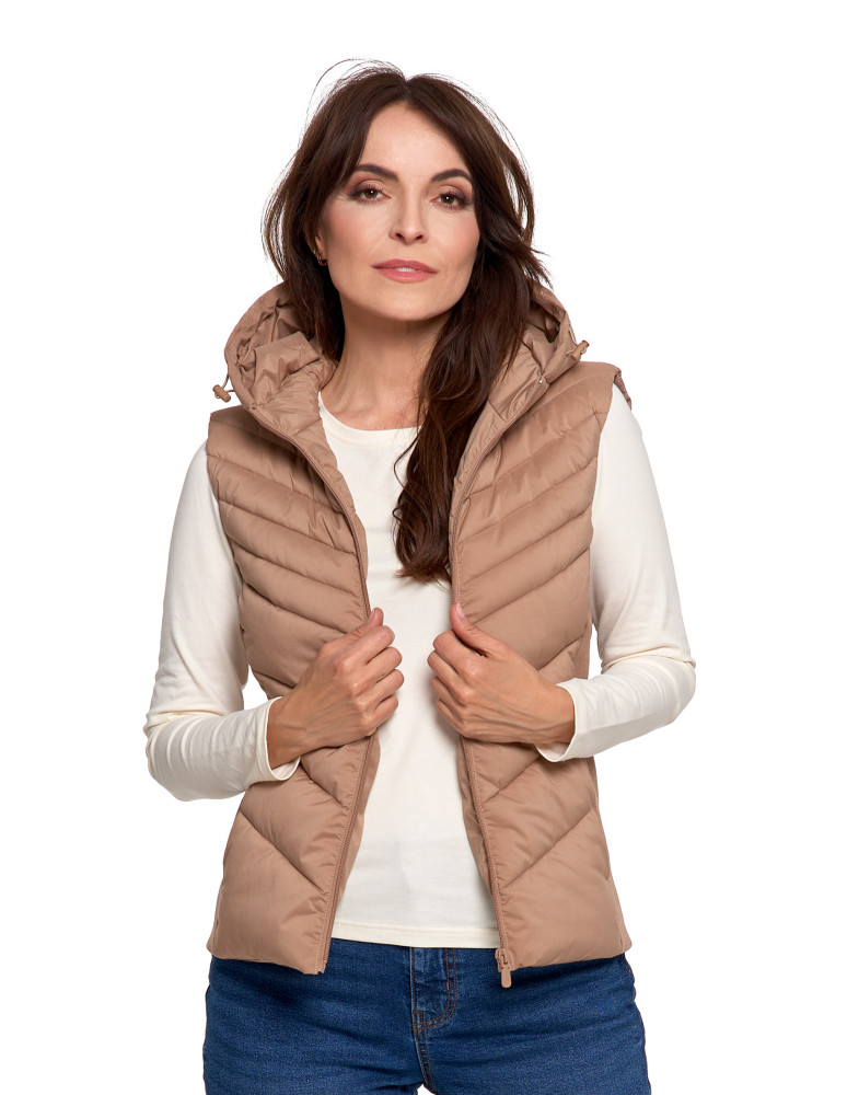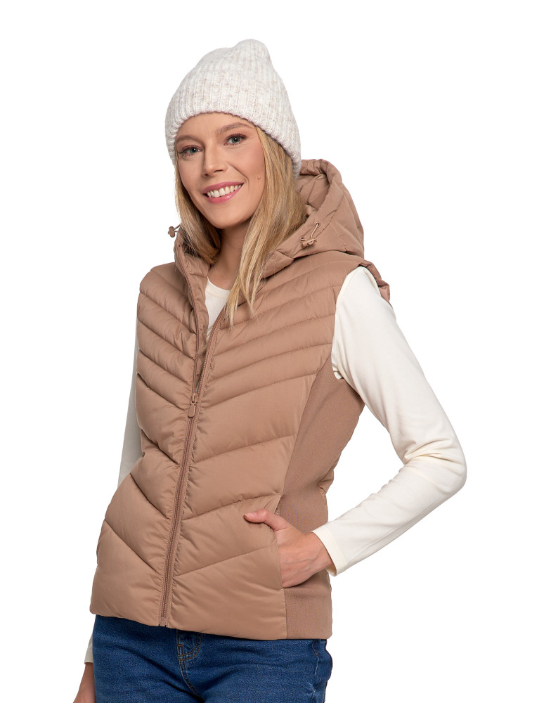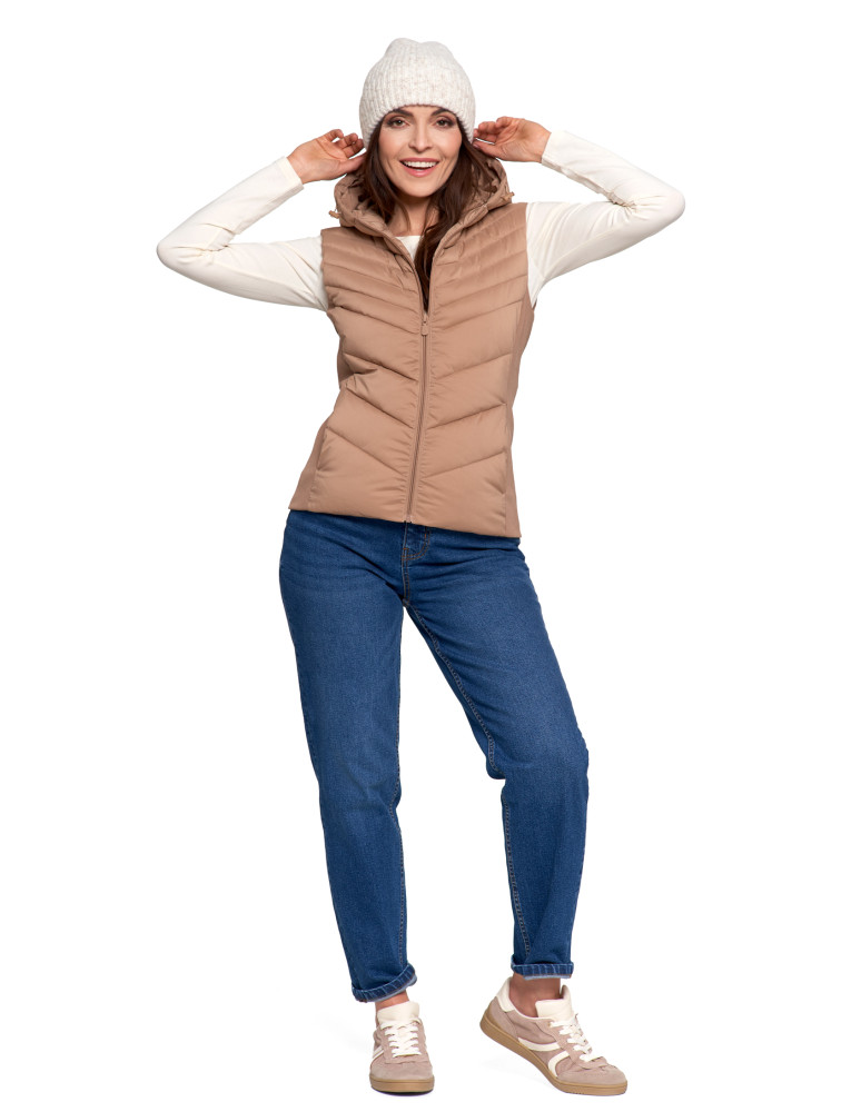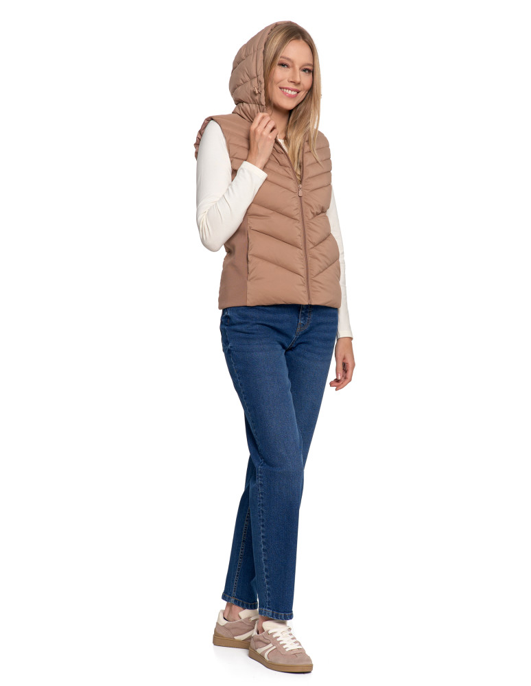 Damska kamizelka krótka pikowana z kapturem BEŻOWY