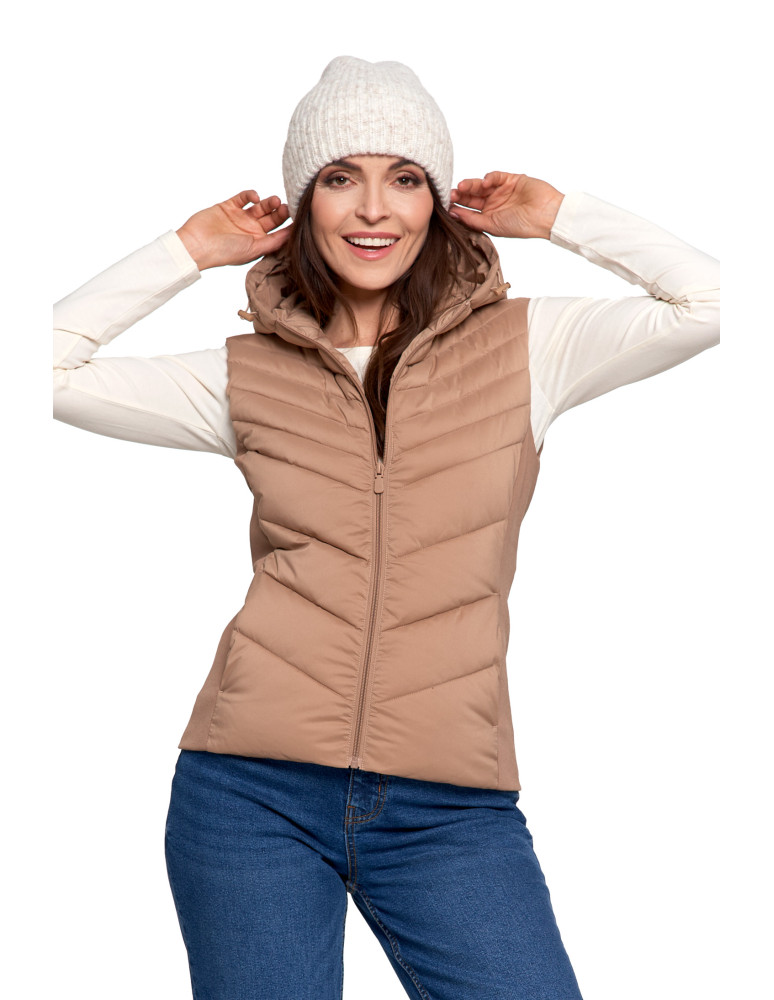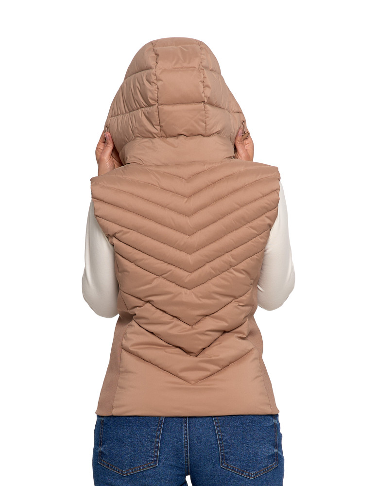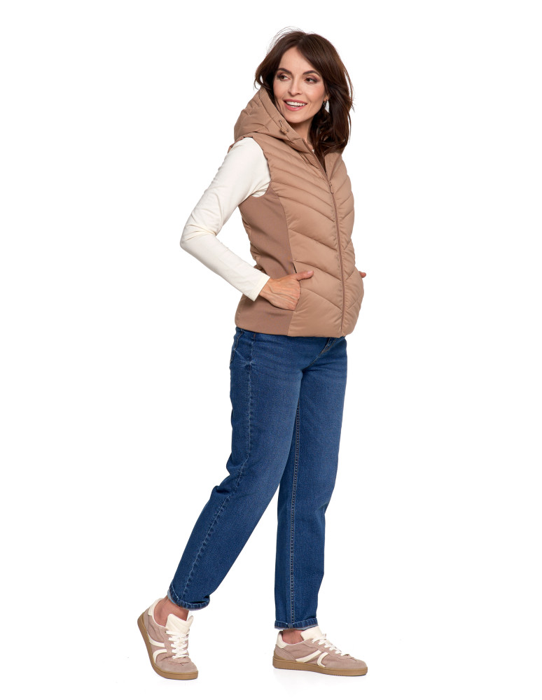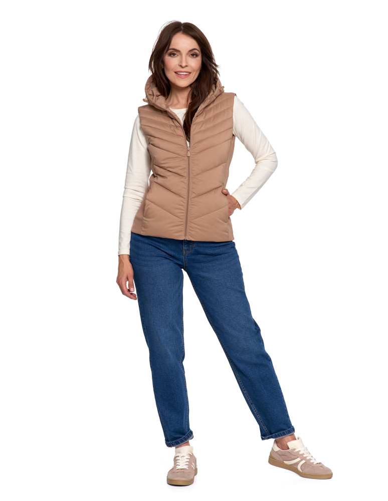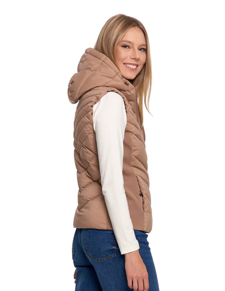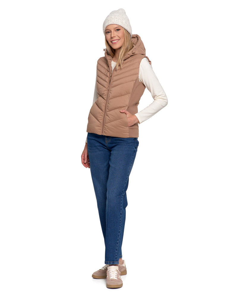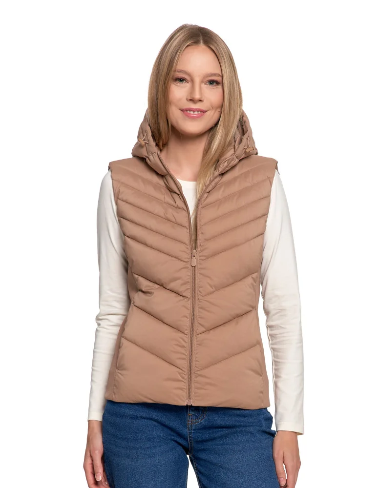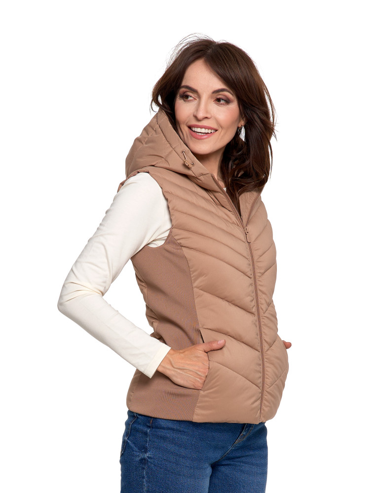 Damska kamizelka krótka pikowana z kapturem BEŻOWY