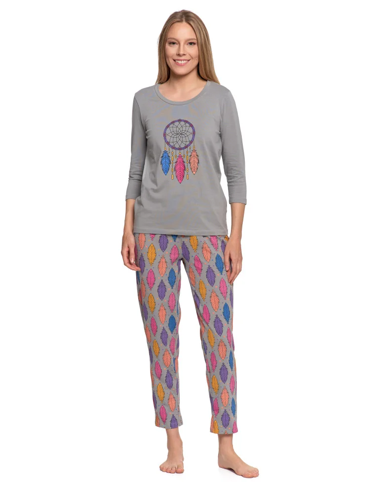 Piżama damska dwuczęściowa z rękawem 3/4 motyw łapacza snów SZARY
