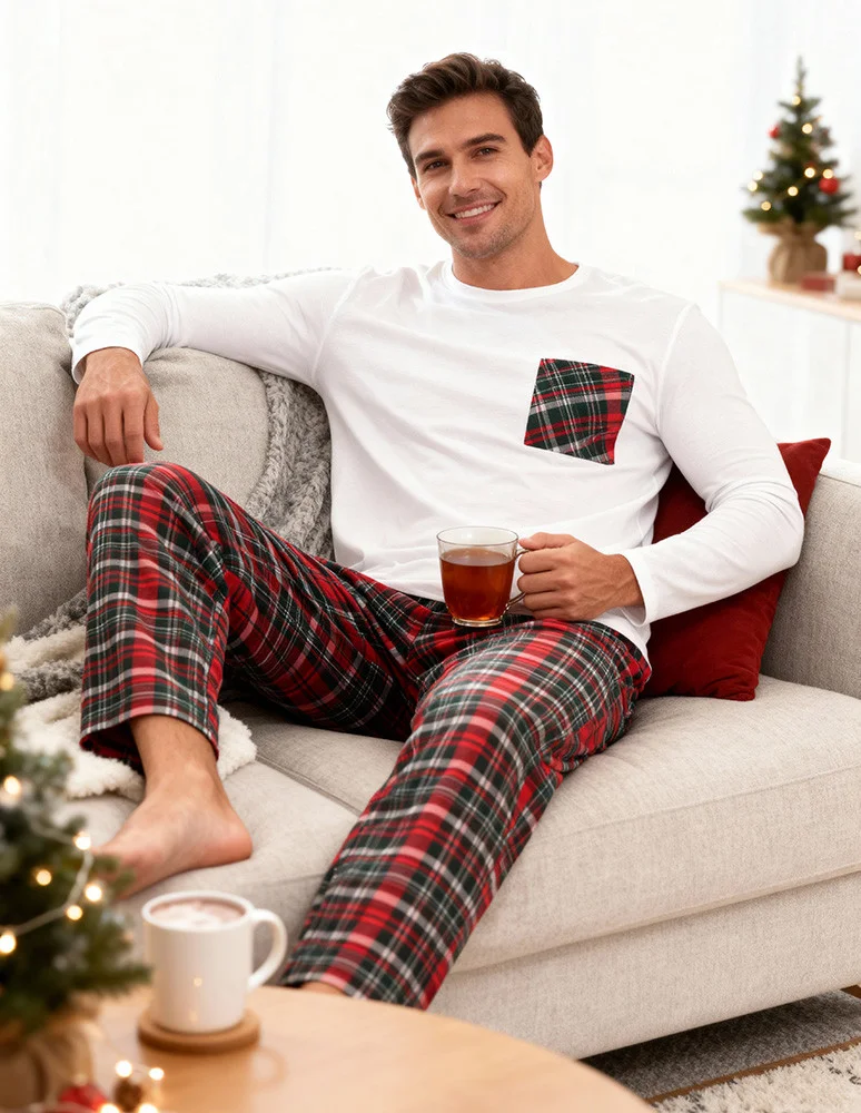 Męska piżama z kraciastymi spodniami i białą koszulką WZÓR 1