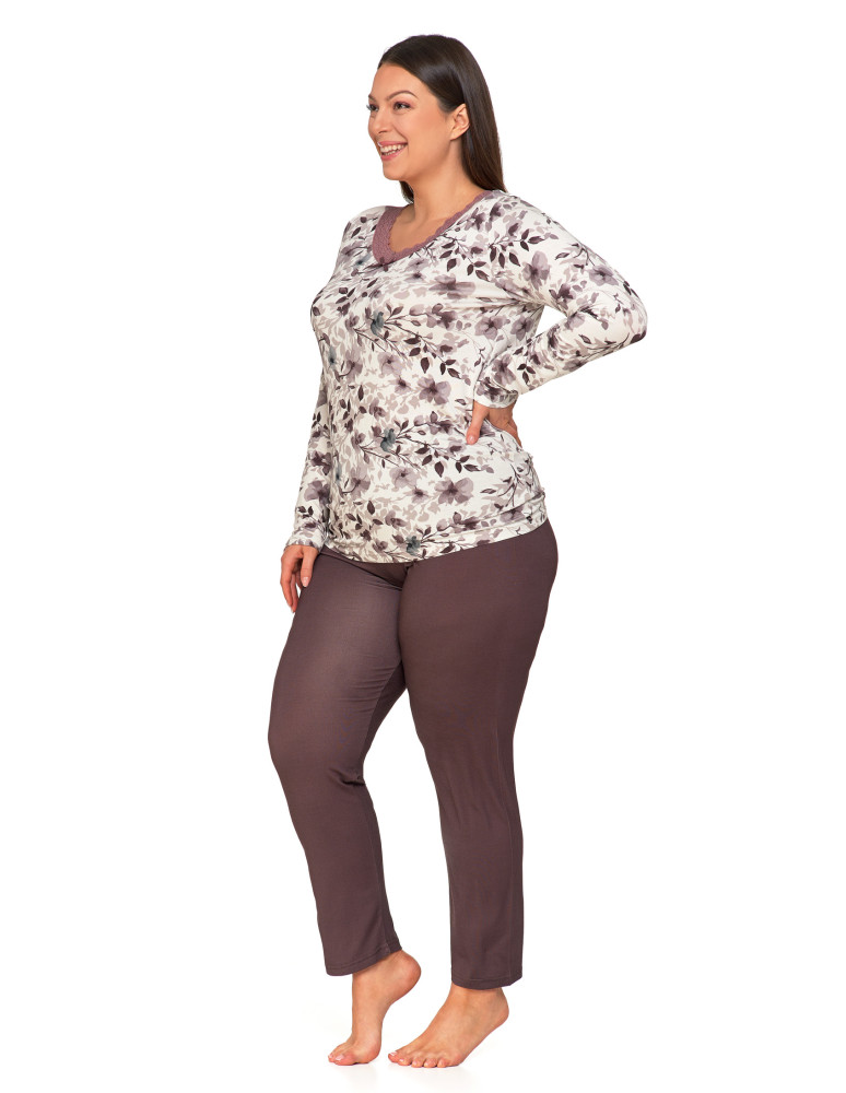 Damska piżama długa Plus Size z kwiatową bluzką BEŻOWY