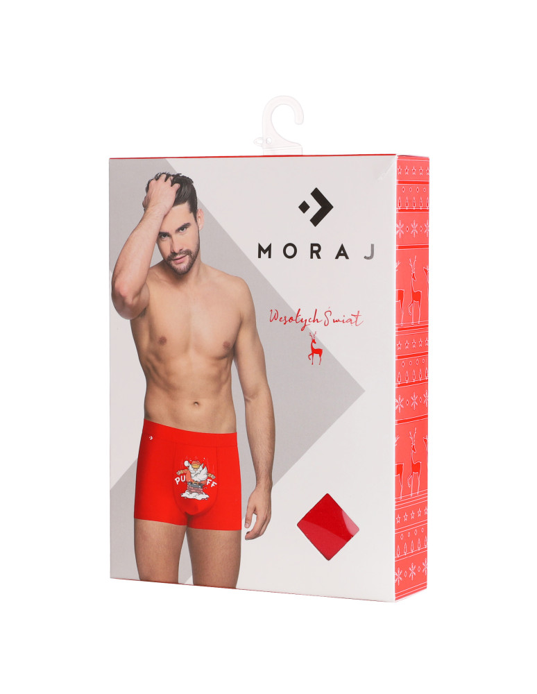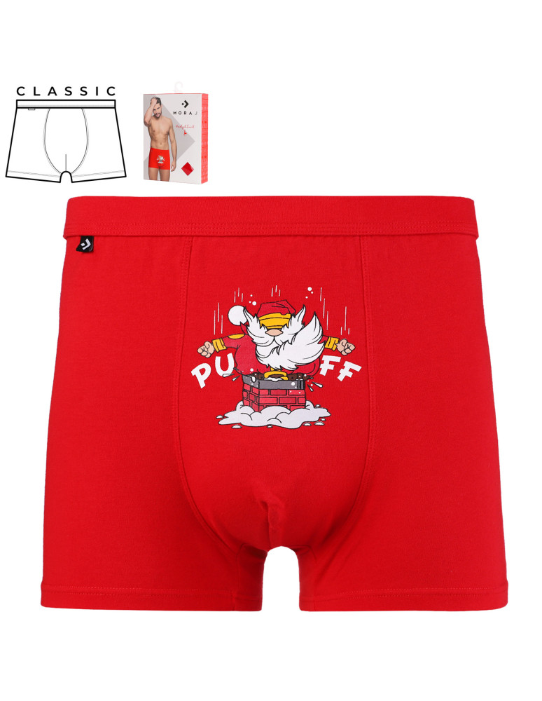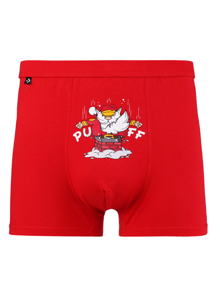 Męskie bokserki świąteczne z motywem Mikołaja do aktywnego wyboru na prezent z okazji Mikołajek lub świąt. Wykonane z miękkiej bawełny z miękkiego elastanu, wygodne i doskonałe zastosowania przez cały dzień. Bokserki w czerwonym kolorze są wyposażone w humorystyczny sposób podłączenia Mikołaja, który występuje z komina oraz napisem „Puff Off”, co nadaje im uroczy, świąteczny charakter. Elastyczny pas oraz klasyczny krój noszenia. To idealny dodatek do świątecznej potrawy, który z dodatkiem uśmiechu i wprowadzi świąteczną atmosferę. Doskonały pomysł na upominek dla każdego mężczyzny!