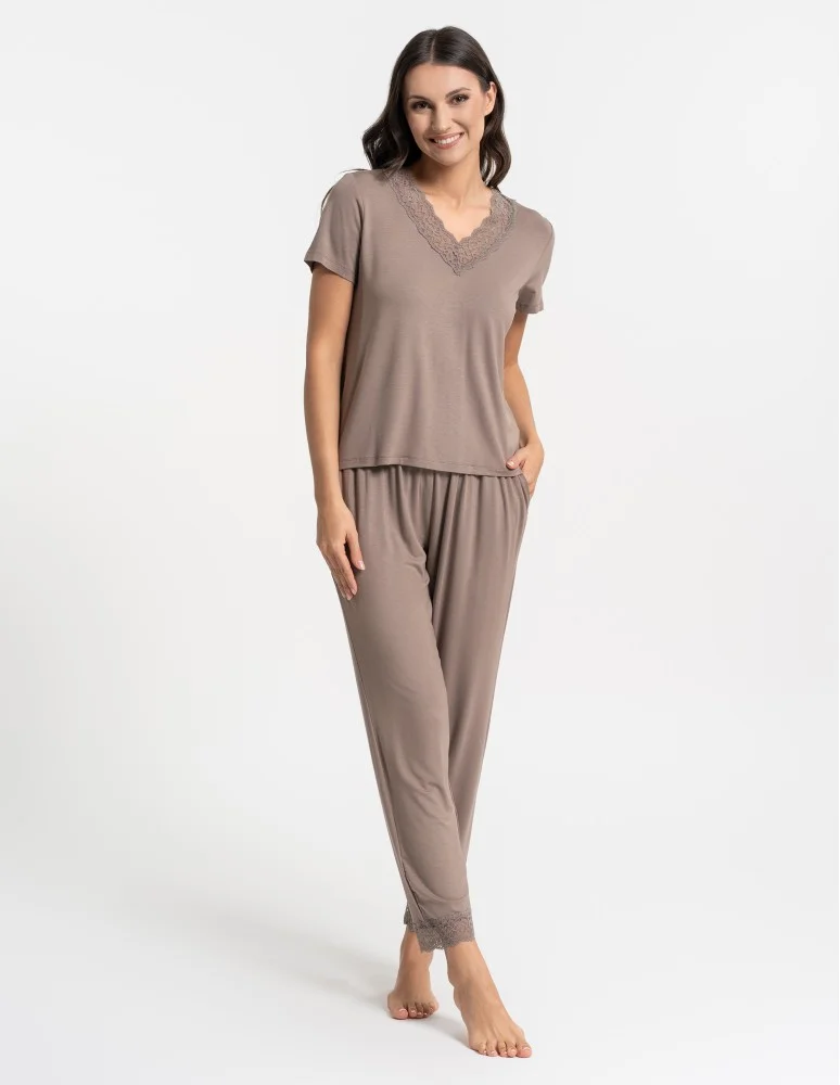 Bluzka z krótkim rękawem oraz delikatnym, koronkowym dekoltem w kształcie litery V nadaje całości kobiecego, subtelnego charakteru. Długie spodnie z elastyczną talią zapewniają wygodę i swobodę ruchów - bez ucisku i dyskomfortu.