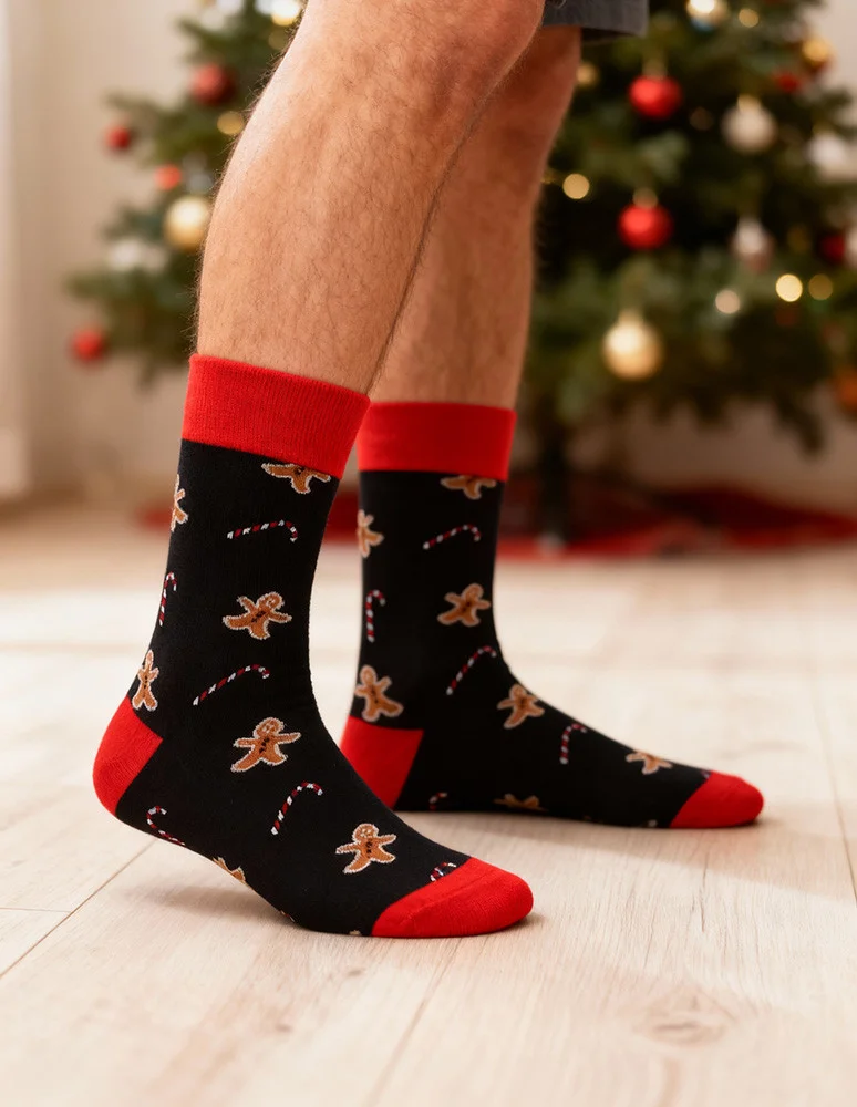 Świąteczne skarpetki z pierniczkiem 2-pak to idealny wybór na prezent na Mikołajki, Święta lub Gwiazdkę. W zestawie 2 pary dwie różne: jedna ozdobiona haftowanym pierniczkiem na czarnych, a drugim z całościowym świętem uroczystości pierniczków i lasek cukrowych. Skarpetki są gotowe do wręczenia, eleganckie w dekoracyjnej wstążce, co sprawia, że nie trzeba się martwić o dodatkowe opakowanie. Wykonane z miękkiej, elastycznej bawełny z domieszkami, zapewniające komfort i styl podczas świątecznego wystąpienia. Idealne na każdą zimową opcję!
