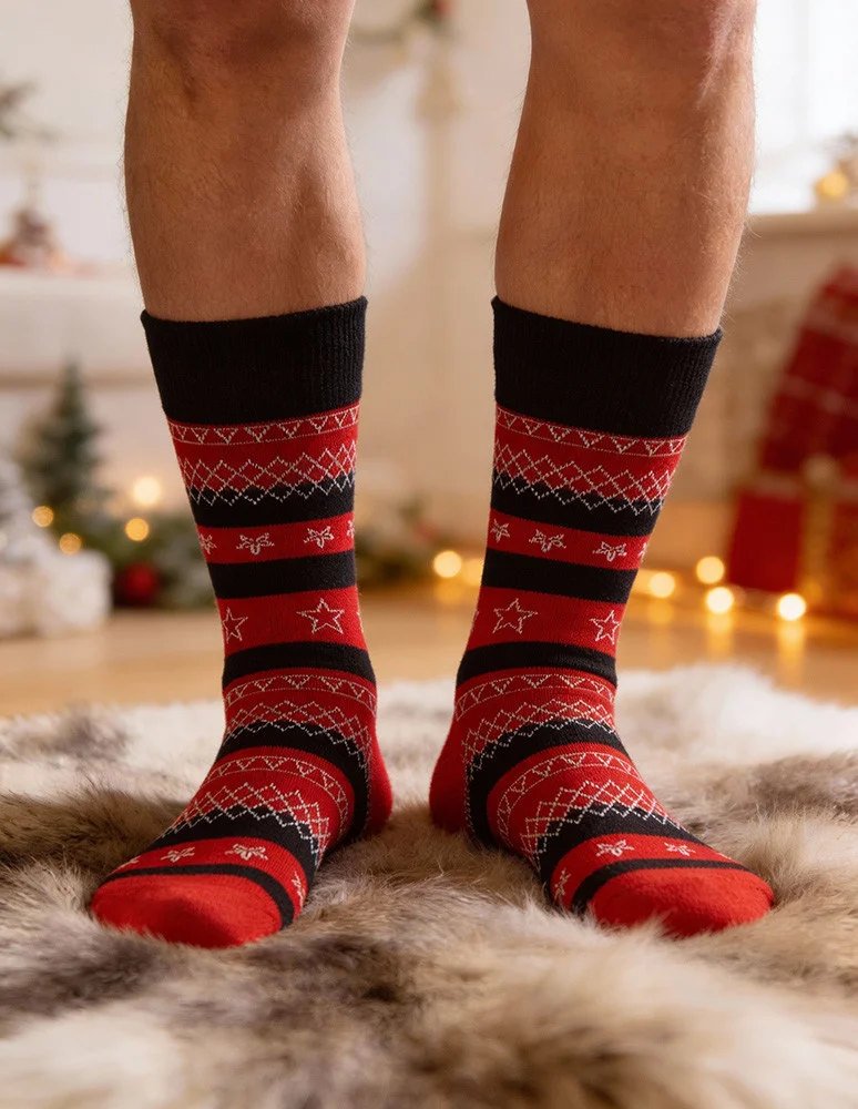 Zestaw męskich skarpet świątecznych w bombki i gwiazdy 2-pak to doskonały wybór na prezent. W zestawie znajdują się dwie pary skarpet: jedna czarna, ozdobiona subtelnym wzorem kolorowych świątecznych bombek, oraz druga w intensywnej czerwieni z czarnymi paskami, udekorowana białymi motywami gwiazd, kokardek i geometrycznych wzorów. Skarpetki wykonane są z miękkiej bawełny z domieszką elastycznych włókien, co zapewnia komfort noszenia i idealne dopasowanie przez cały dzień. Całość zapakowana w elegancką wstążkę, stanowi gotowy upominek, który doda świątecznego nastroju do każdej stylizacji, oferując jednocześnie ciepło i wygodę w zimowe dni.