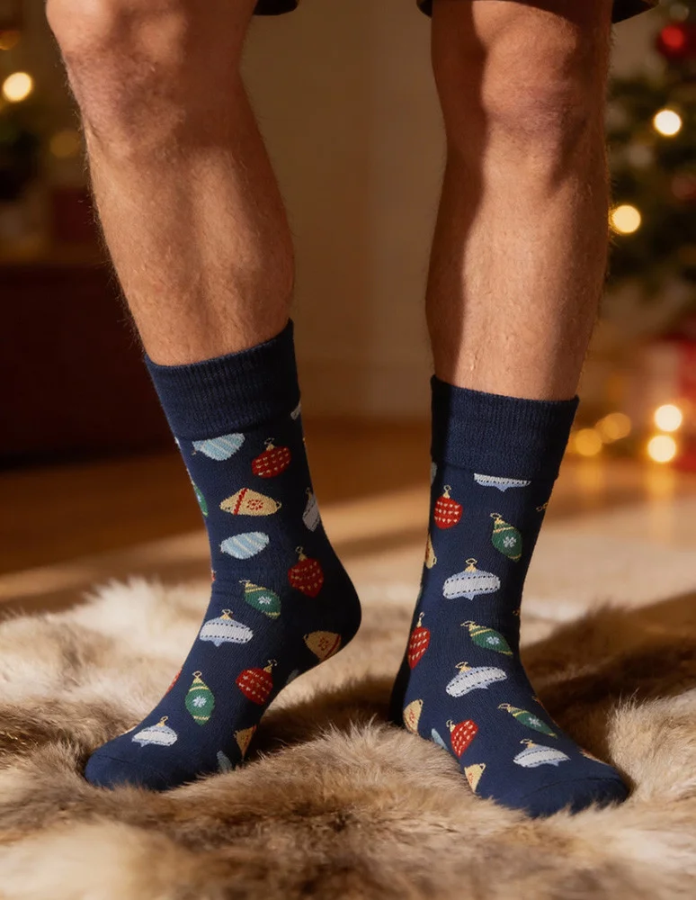 Zestaw skarpetek świątecznych w bombki i światełka 2-pak to idealny wybór na prezent na Mikołajki, Święta lub Gwiazdkę. W zestawie znajdują się dwie różne pary: jedna ozdobiona głównymi elementami bombek na granatowym tle, a druga pełna uroku ze czerwonych lampek choinkowych, które przypominają świąteczne lampki. Skarpetki wykonane są z miękkiej i elastycznej bawełny, która zapewnia komfort i wygodę przez cały dzień. Elegancko wyposażone w dekoracyjną wstążkę, stanowią gotowe do wręczenia upominek. Te stylowe skarpetki to odpowiedni sposób na odrobiny świątecznej, do której można zwrócić uwagę.