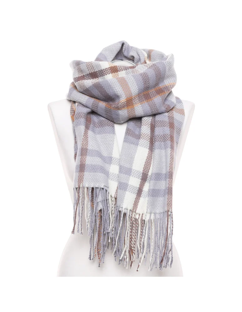 Elegancki szal damski w kratę z frędzlami NIEBIESKI
