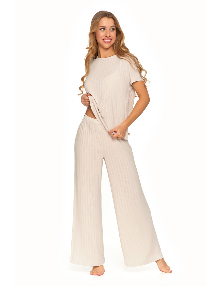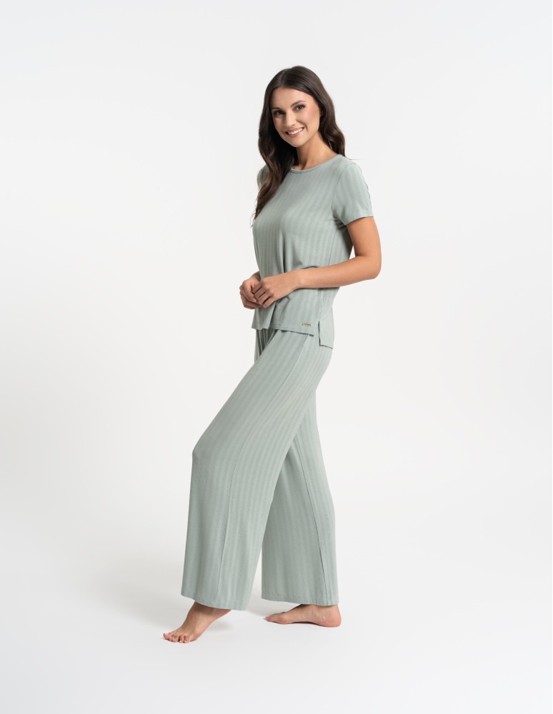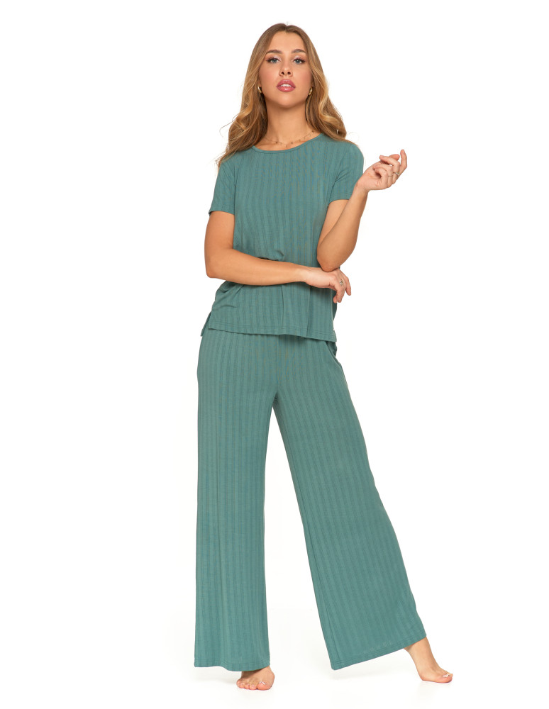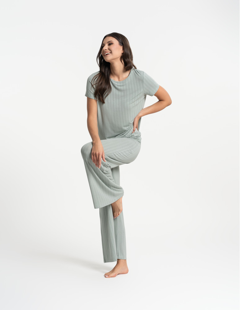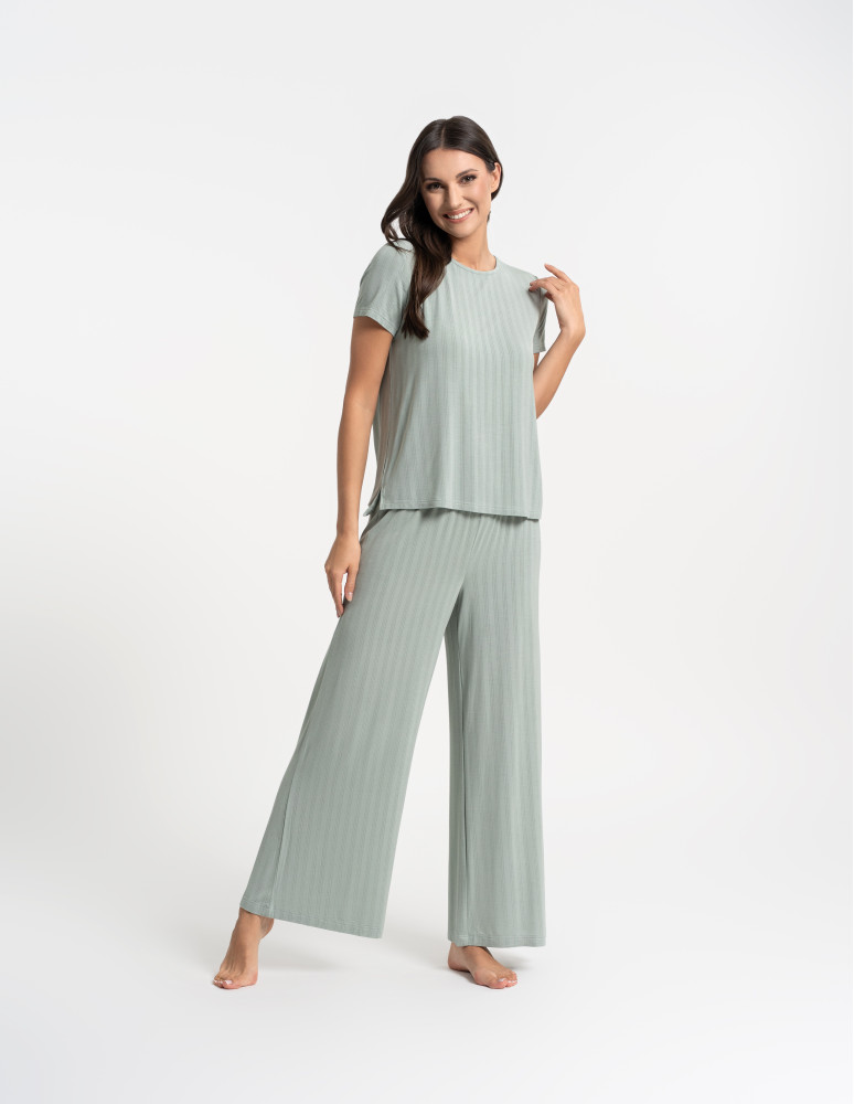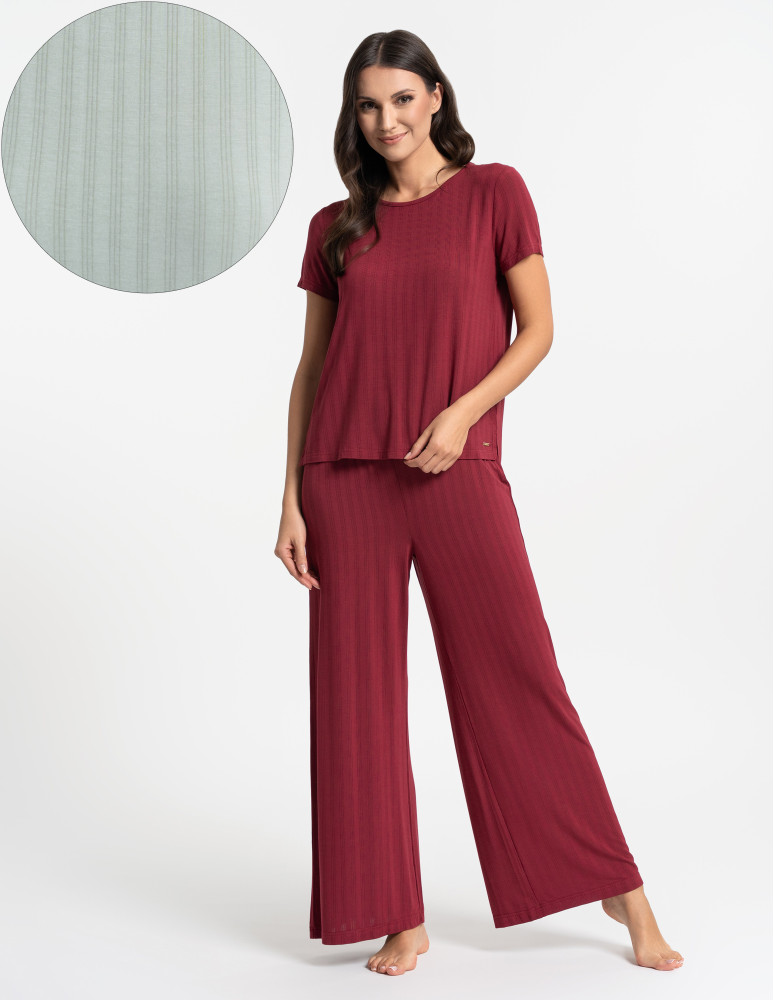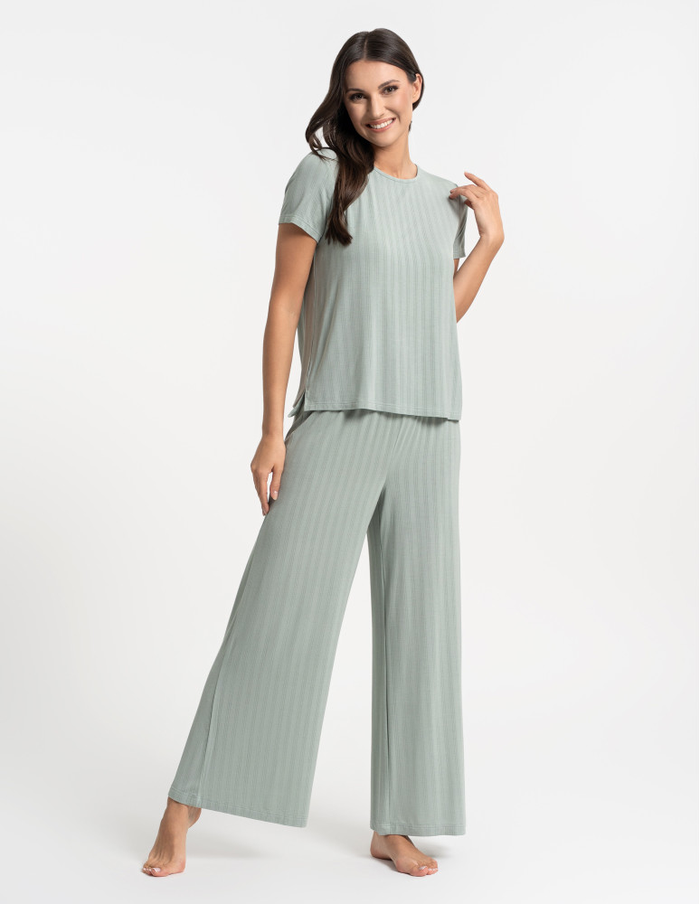 Odkryj luksusową piżamę, która łączy elegancję, komfort i naturalną swobodę. Ten wyjątkowy dwuczęściowy komplet składa się z luźnej bluzki z krótkim rękawem oraz szerokich, długich spodni, tworząc stylowy i wygodny zestaw do relaksu i snu. Minimalistyczny design i subtelne prążkowanie nadają jej wyjątkowego charakteru. Wykonana z najwyższej jakości modalu z dodatkiem elastanu, zachwyca swoją miękkością, delikatnością i przewiewnością. Modal, pozyskiwany z naturalnych włókien celulozowych, jest jedwabisty w dotyku, nie traci swojej gładkości nawet po wielu praniach i skutecznie odprowadza wilgoć, zapewniając uczucie świeżości przez całą noc. Dodatek elastanu sprawia, że tkanina jest elastyczna, idealnie dopasowuje się do sylwetki i nie krępuje ruchów, oferując maksymalny komfort noszenia. Szerokie, lejące się spodnie i luźna bluzka sprawiają, że zestaw doskonale wpisuje się w potrzeby kobiet ceniących wygodę i styl. To idealna piżama zarówno do snu, jak i jako domowy strój do relaksu, gwarantujący wyjątkową miękkość i swobodę ruchów przez cały dzień.