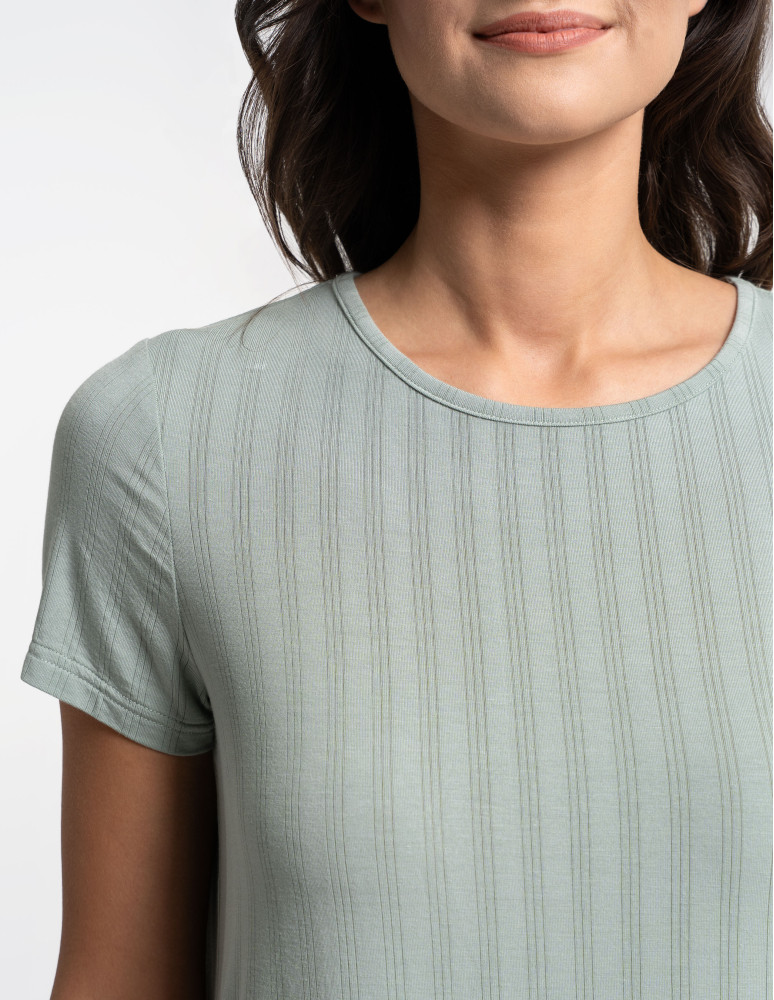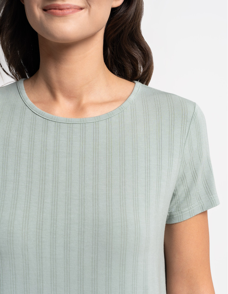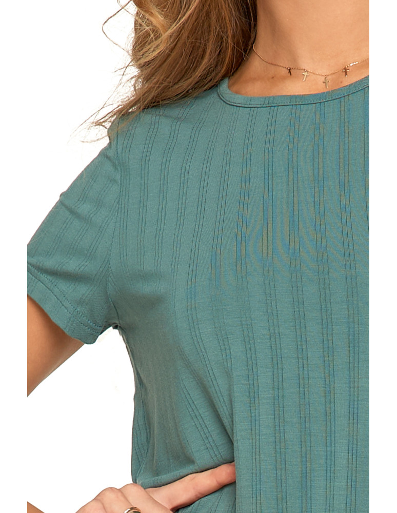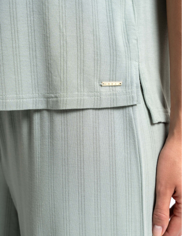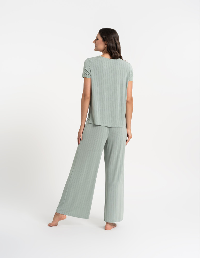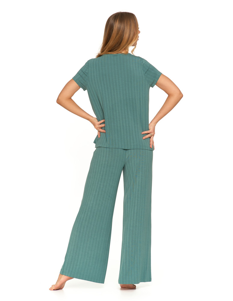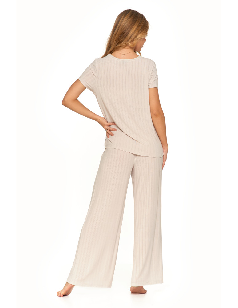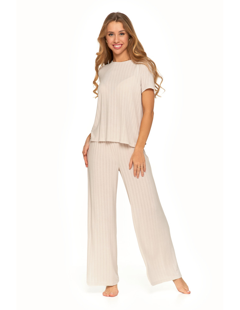 Odkryj luksusową piżamę, która łączy elegancję, komfort i naturalną swobodę. Ten wyjątkowy dwuczęściowy komplet składa się z luźnej bluzki z krótkim rękawem oraz szerokich, długich spodni, tworząc stylowy i wygodny zestaw do relaksu i snu. Minimalistyczny design i subtelne prążkowanie nadają jej wyjątkowego charakteru. Wykonana z najwyższej jakości modalu z dodatkiem elastanu, zachwyca swoją miękkością, delikatnością i przewiewnością. Modal, pozyskiwany z naturalnych włókien celulozowych, jest jedwabisty w dotyku, nie traci swojej gładkości nawet po wielu praniach i skutecznie odprowadza wilgoć, zapewniając uczucie świeżości przez całą noc. Dodatek elastanu sprawia, że tkanina jest elastyczna, idealnie dopasowuje się do sylwetki i nie krępuje ruchów, oferując maksymalny komfort noszenia. Szerokie, lejące się spodnie i luźna bluzka sprawiają, że zestaw doskonale wpisuje się w potrzeby kobiet ceniących wygodę i styl. To idealna piżama zarówno do snu, jak i jako domowy strój do relaksu, gwarantujący wyjątkową miękkość i swobodę ruchów przez cały dzień.