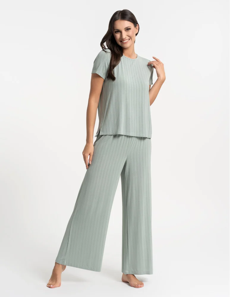 Piżama damska dwuczęściowa z szerokimi spodniami JASNY ZIELONY