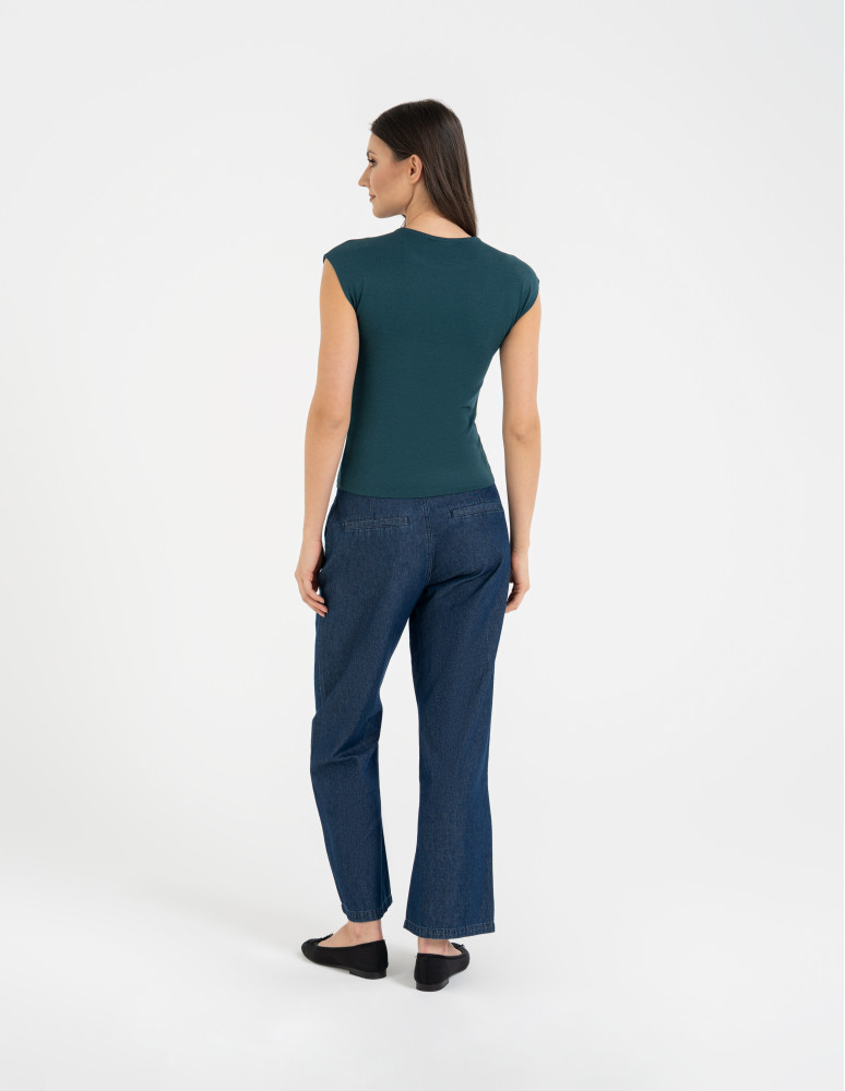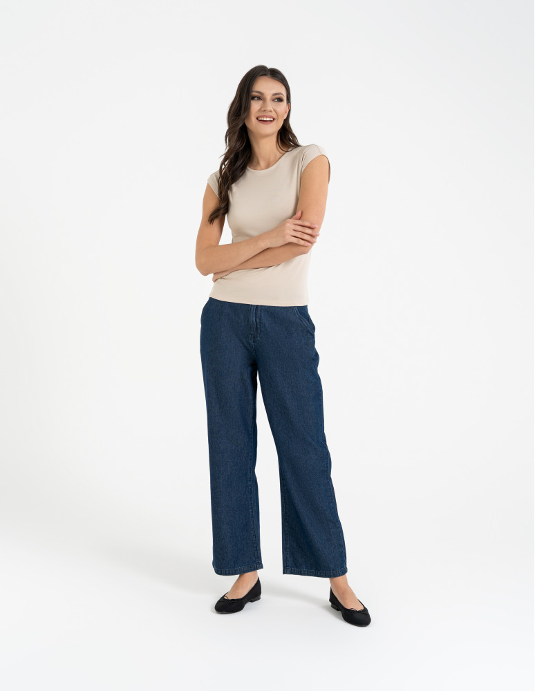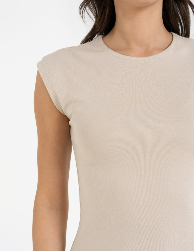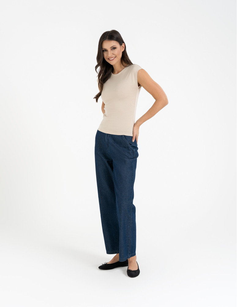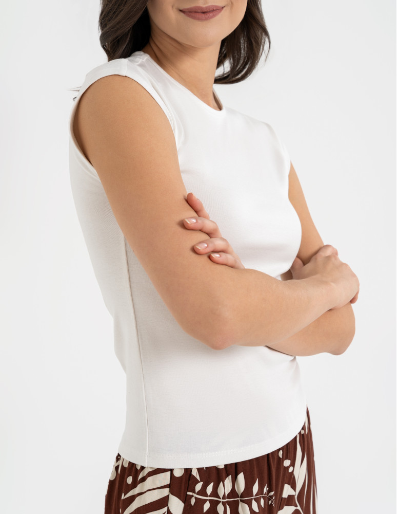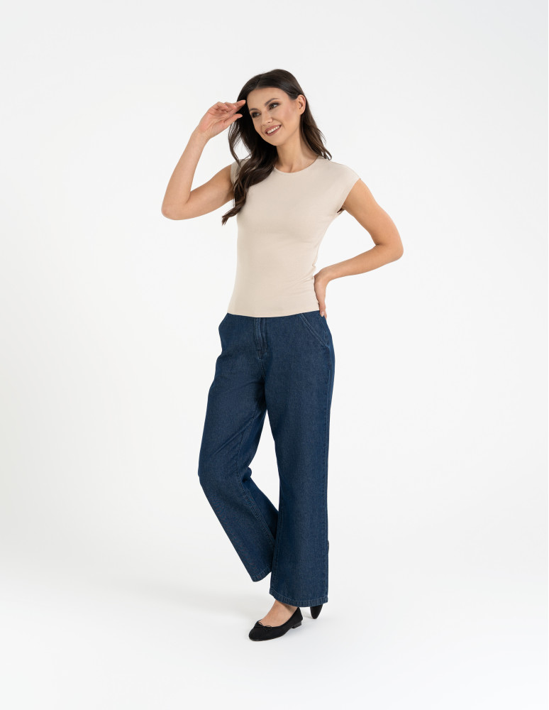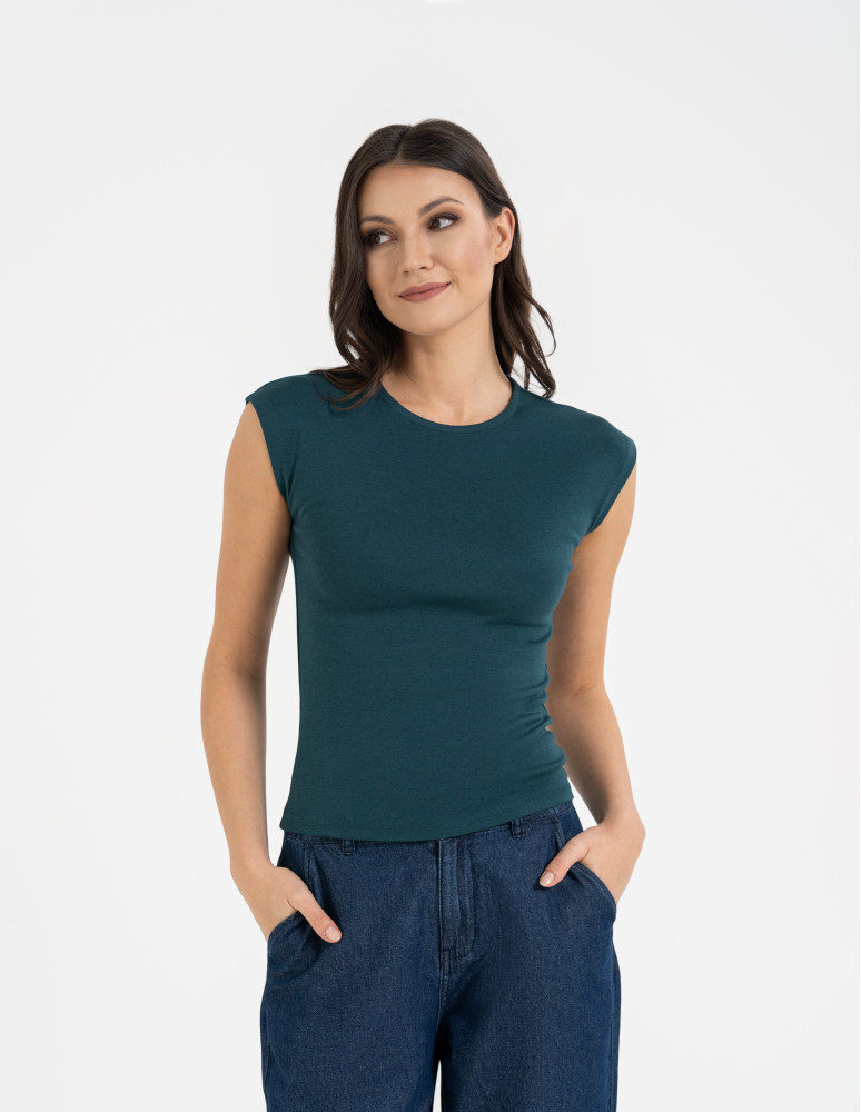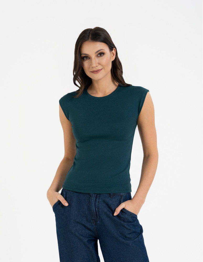 Uniwersalna i ponadczasowa bluzka damska, która łączy w sobie wygodę i elegancję, będąc doskonałym wyborem na każdą okazję. Jej dopasowany fason subtelnie podkreśla sylwetkę, nie krępując przy tym ruchów, dzięki czemu świetnie sprawdzi się zarówno w codziennych, jak i bardziej eleganckich stylizacjach. Bluzka została wykonana z wysokiej jakości, miękkiej dzianiny o drobnym prążkowanym splocie, który nadaje jej wyjątkową elastyczność i komfort noszenia. Materiał jest przyjemny w dotyku, delikatnie otula ciało, gwarantując wygodę przez cały dzień. Prążkowana struktura tkaniny dodaje subtelnej faktury i lekko modeluje sylwetkę, sprawiając, że bluzka prezentuje się stylowo i kobieco. Krótki rękaw typu cap sleeve to jeden z najbardziej kobiecych elementów tej bluzki. Jest on lekko przedłużony i delikatnie okala ramiona, nadając całości eleganckiego, ale zarazem subtelnie sportowego charakteru. To doskonałe rozwiązanie dla osób, które cenią sobie wygodę, ale nie chcą rezygnować z estetycznego wyglądu. Klasyczny, zaokrąglony dekolt sprawia, że bluzka pasuje do wielu stylizacji można ją nosić solo w cieplejsze dni lub jako bazę pod marynarkę czy kardigan. To model, który idealnie komponuje się zarówno z dopasowanymi spodniami i ołówkową spódnicą, jak i z jeansami czy szortami, tworząc modny i uniwersalną stylizację.