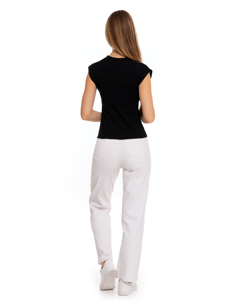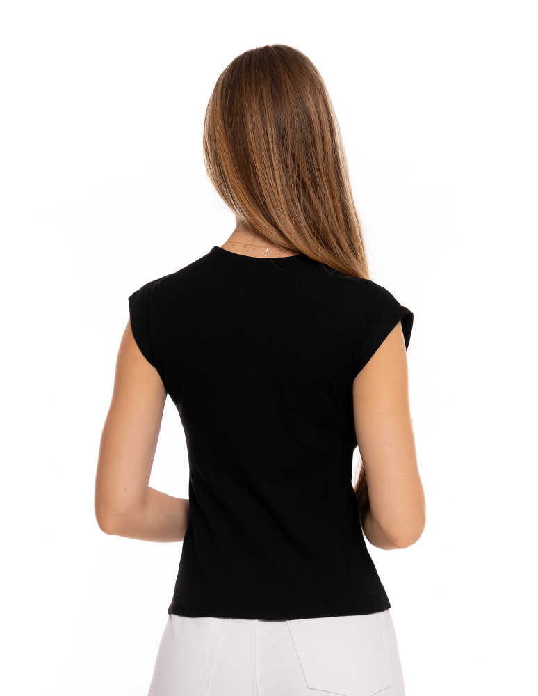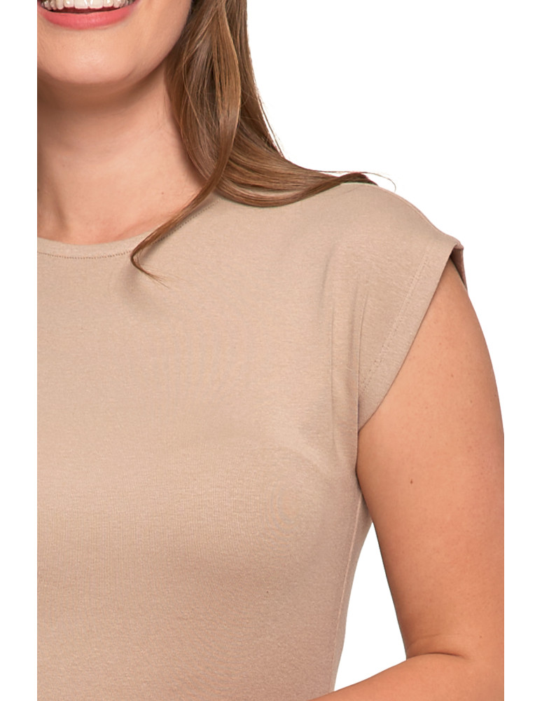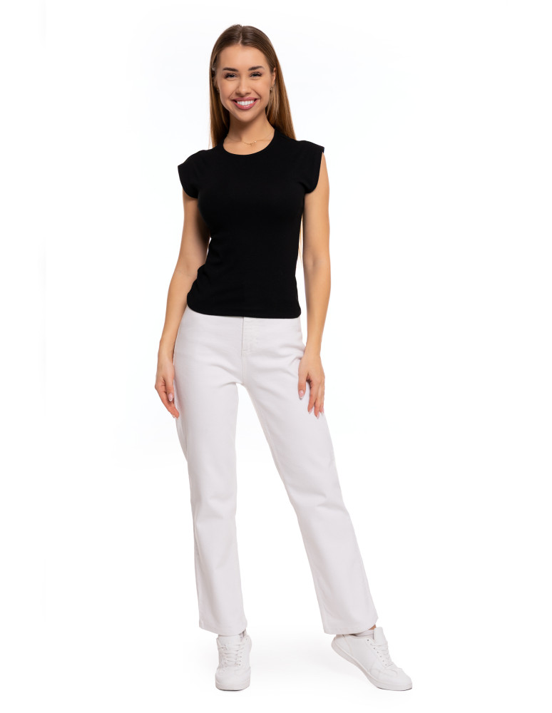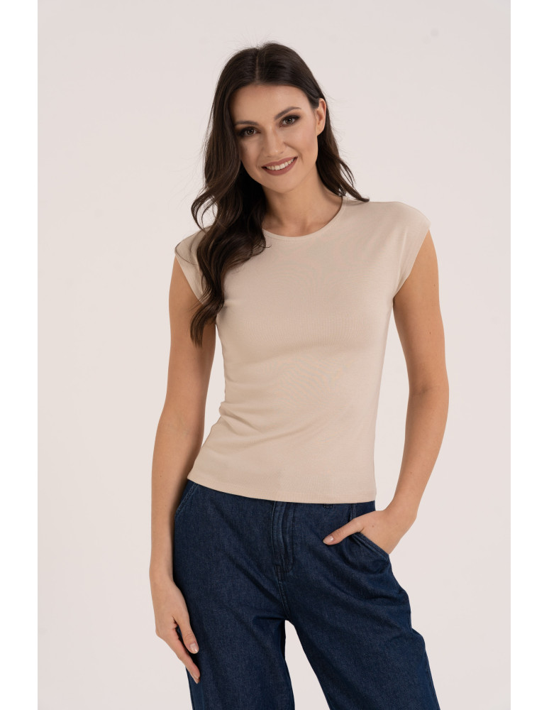 Uniwersalna i ponadczasowa bluzka damska, która łączy w sobie wygodę i elegancję, będąc doskonałym wyborem na każdą okazję. Jej dopasowany fason subtelnie podkreśla sylwetkę, nie krępując przy tym ruchów, dzięki czemu świetnie sprawdzi się zarówno w codziennych, jak i bardziej eleganckich stylizacjach. Bluzka została wykonana z wysokiej jakości, miękkiej dzianiny o drobnym prążkowanym splocie, który nadaje jej wyjątkową elastyczność i komfort noszenia. Materiał jest przyjemny w dotyku, delikatnie otula ciało, gwarantując wygodę przez cały dzień. Prążkowana struktura tkaniny dodaje subtelnej faktury i lekko modeluje sylwetkę, sprawiając, że bluzka prezentuje się stylowo i kobieco. Krótki rękaw typu cap sleeve to jeden z najbardziej kobiecych elementów tej bluzki. Jest on lekko przedłużony i delikatnie okala ramiona, nadając całości eleganckiego, ale zarazem subtelnie sportowego charakteru. To doskonałe rozwiązanie dla osób, które cenią sobie wygodę, ale nie chcą rezygnować z estetycznego wyglądu. Klasyczny, zaokrąglony dekolt sprawia, że bluzka pasuje do wielu stylizacji można ją nosić solo w cieplejsze dni lub jako bazę pod marynarkę czy kardigan. To model, który idealnie komponuje się zarówno z dopasowanymi spodniami i ołówkową spódnicą, jak i z jeansami czy szortami, tworząc modny i uniwersalną stylizację.