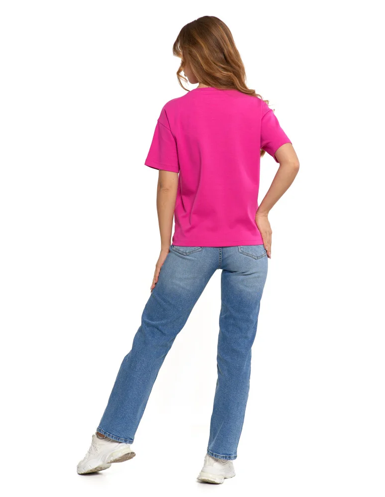 T-shirt damski luźny z haftowanym kwiatkiem FUKSJA