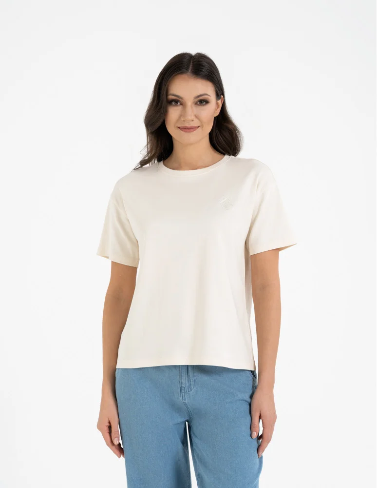 T-shirt damski luźny z haftowanym wzorem KREMOWY
