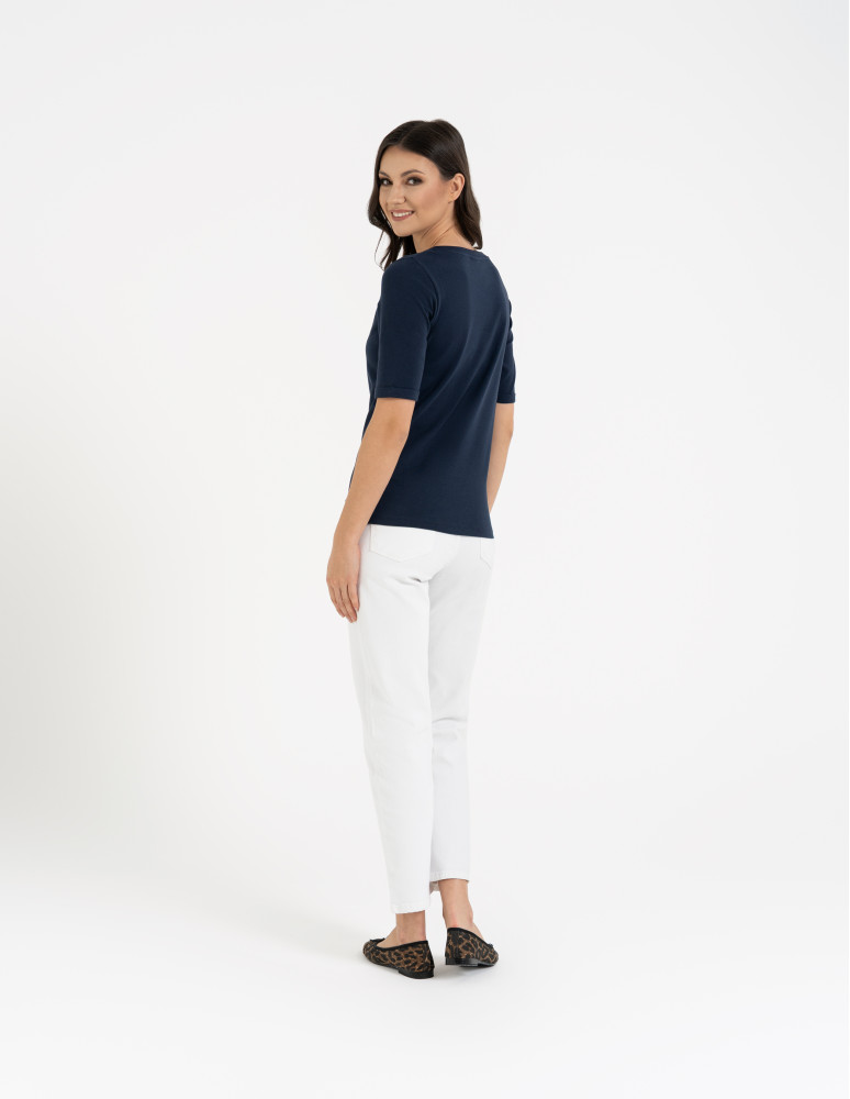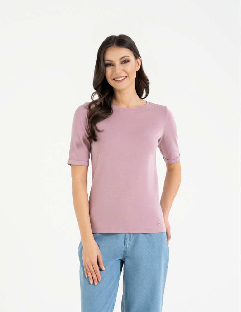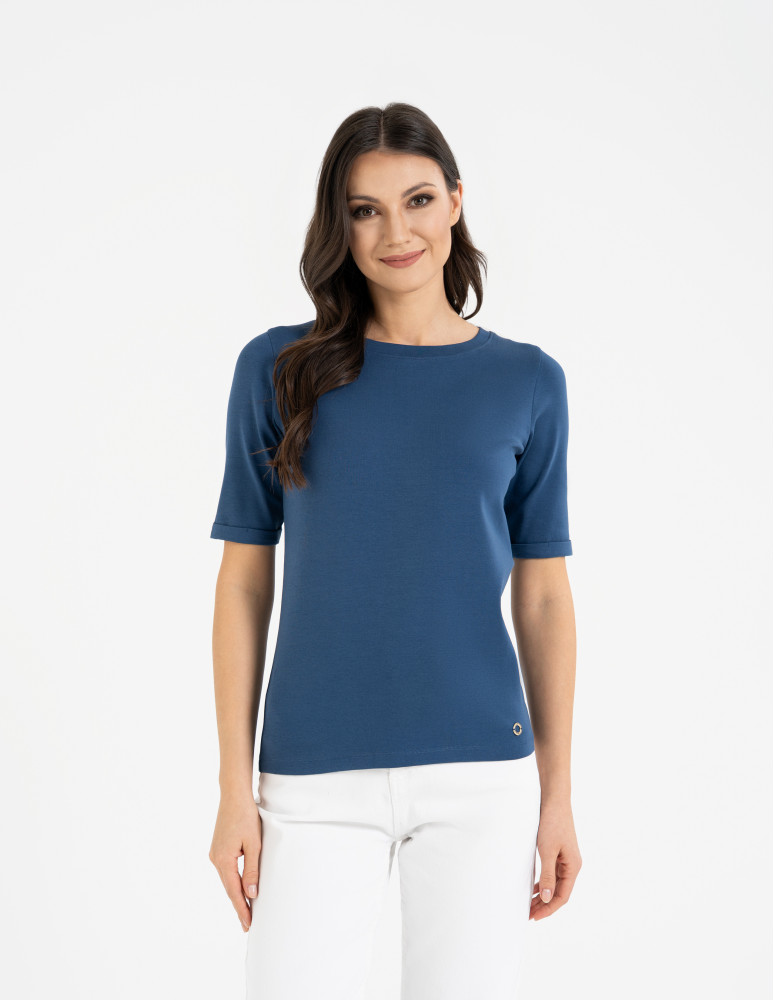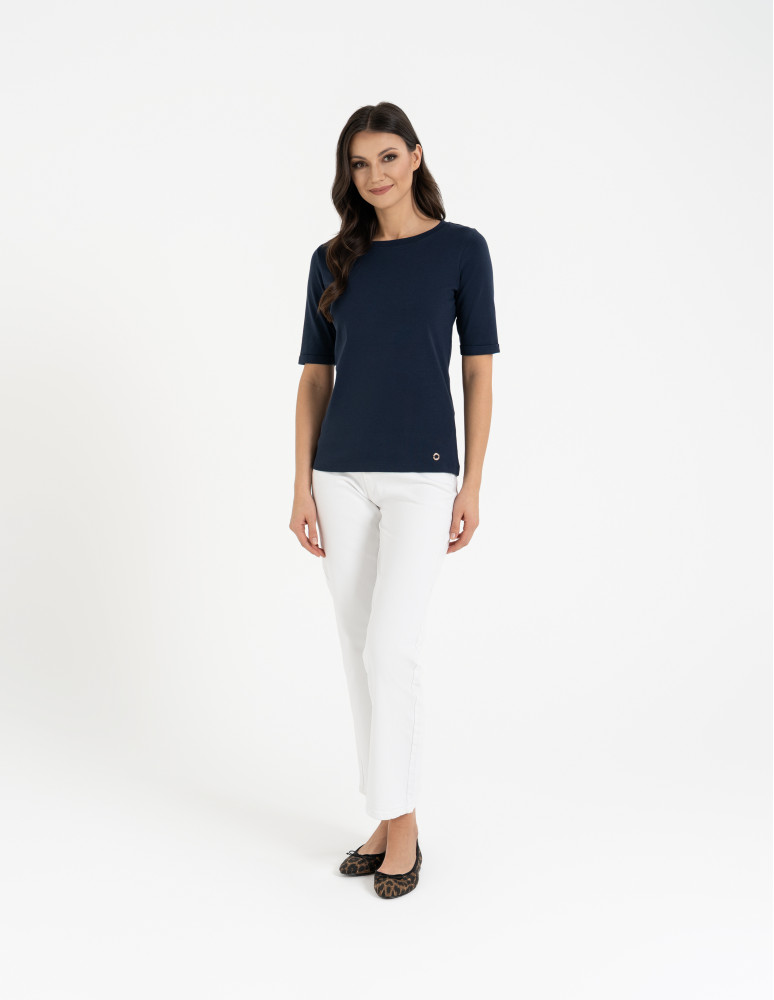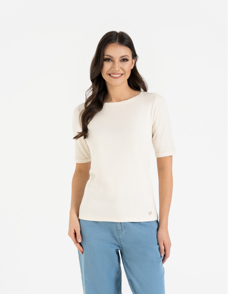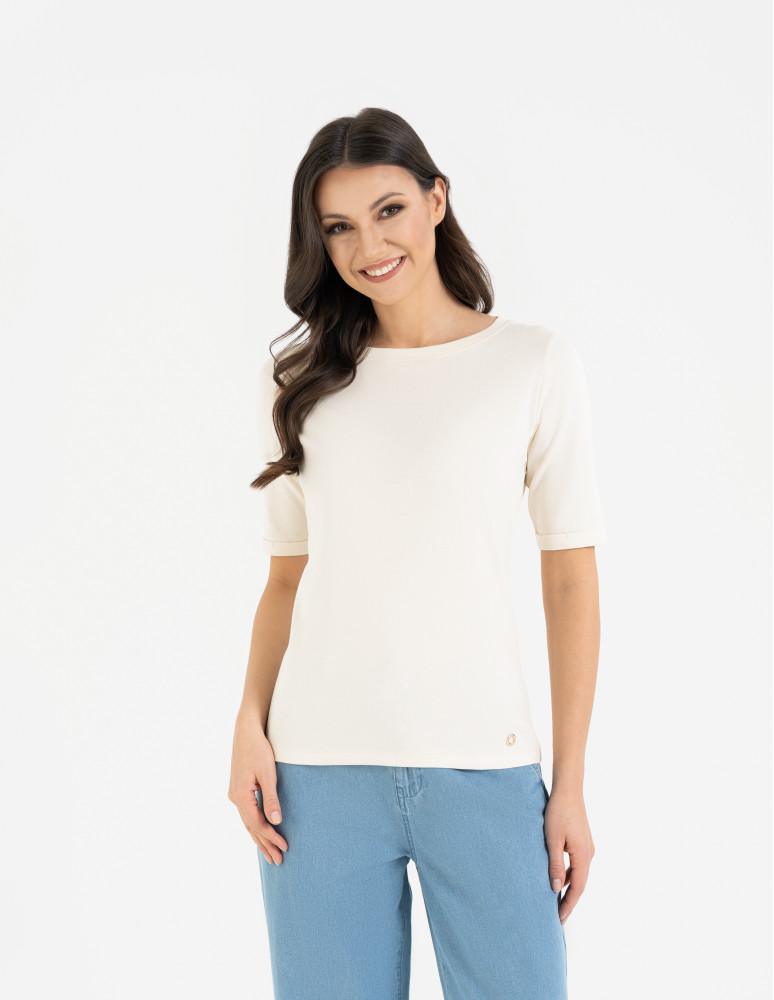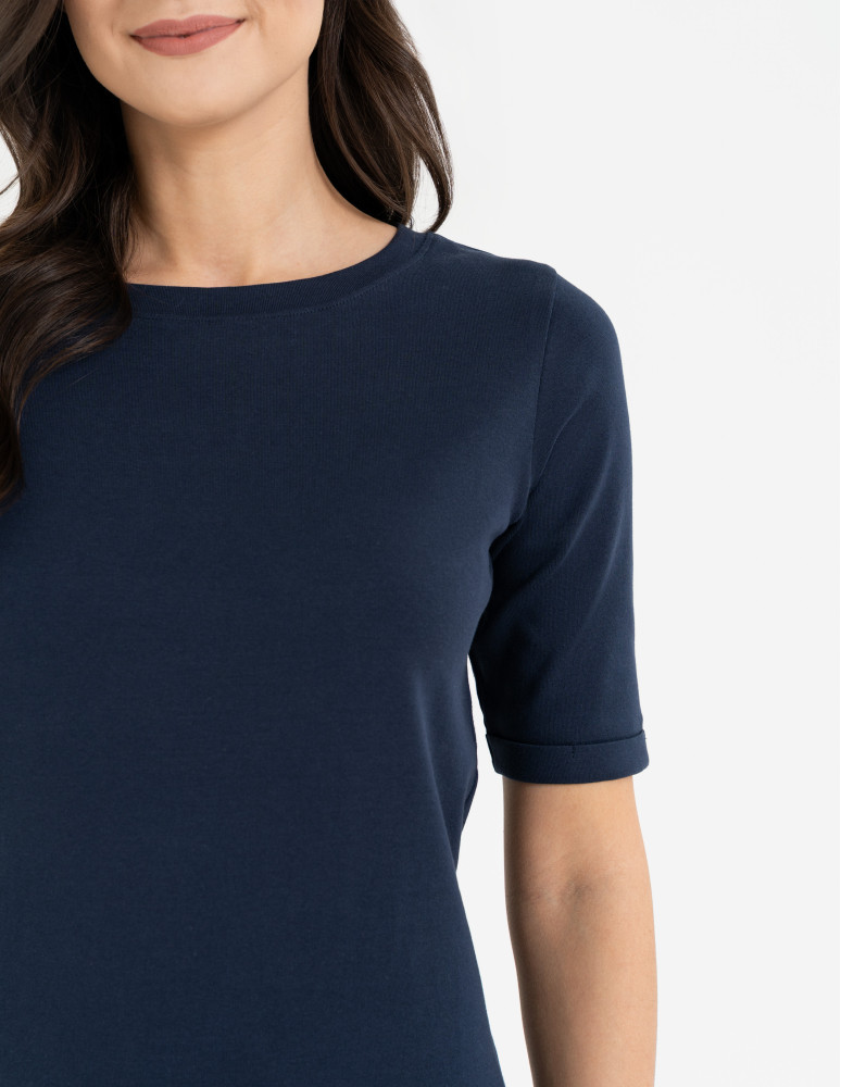 Ta klasyczna bluzka damska to połączenie ponadczasowego stylu i wyjątkowego komfortu. Wykonana z wysokiej jakości bawełny z dodatkiem elastanu, delikatnie dopasowuje się do sylwetki, zapewniając swobodę ruchów i przyjemne uczucie przez cały dzień. Prosty fason z półokrągłym dekoltem podkreśla subtelną kobiecość, a rękawy o długości do łokcia dodają całości nowoczesnego charakteru.