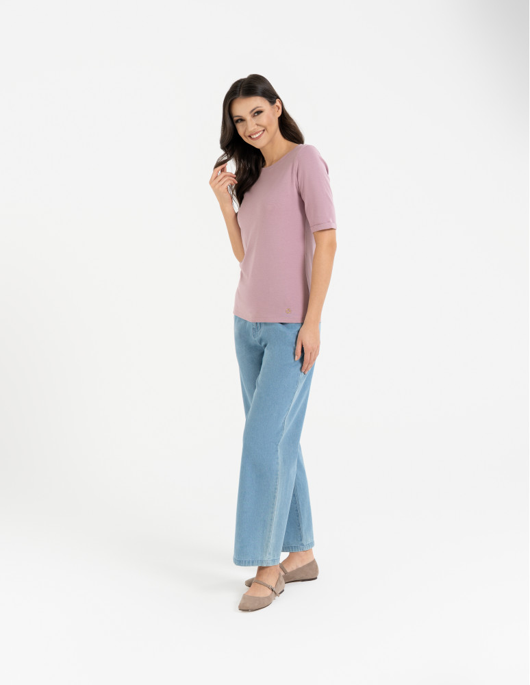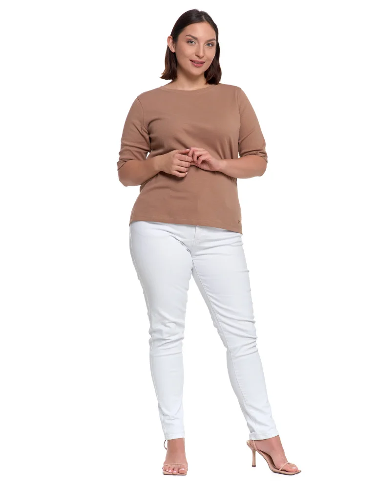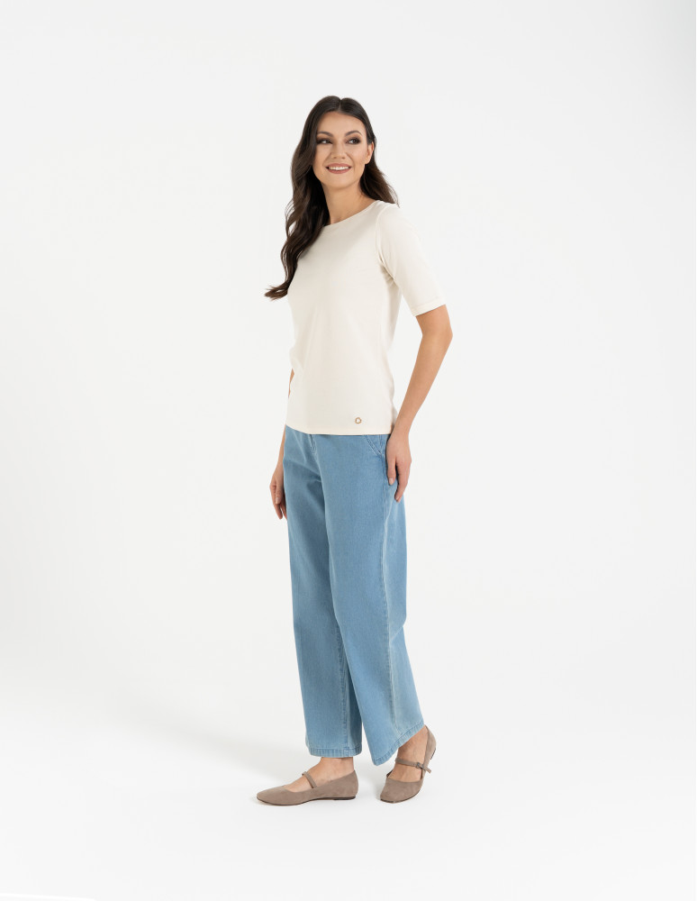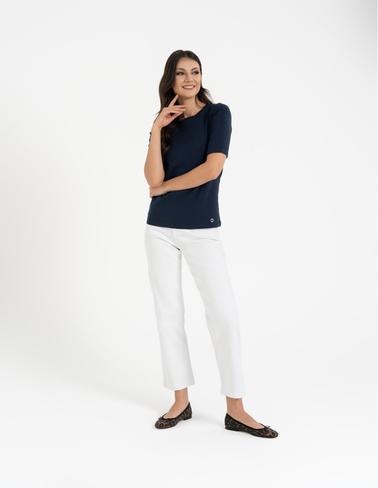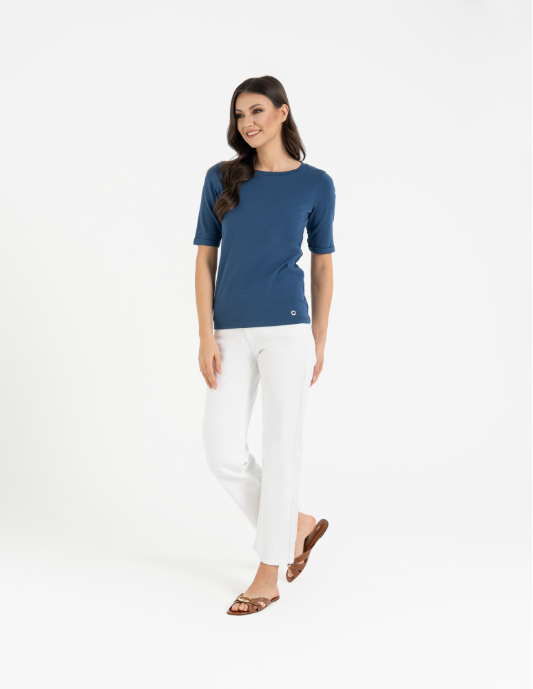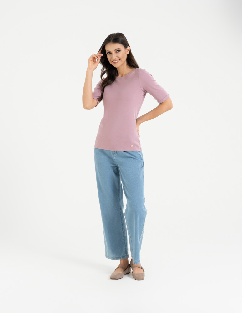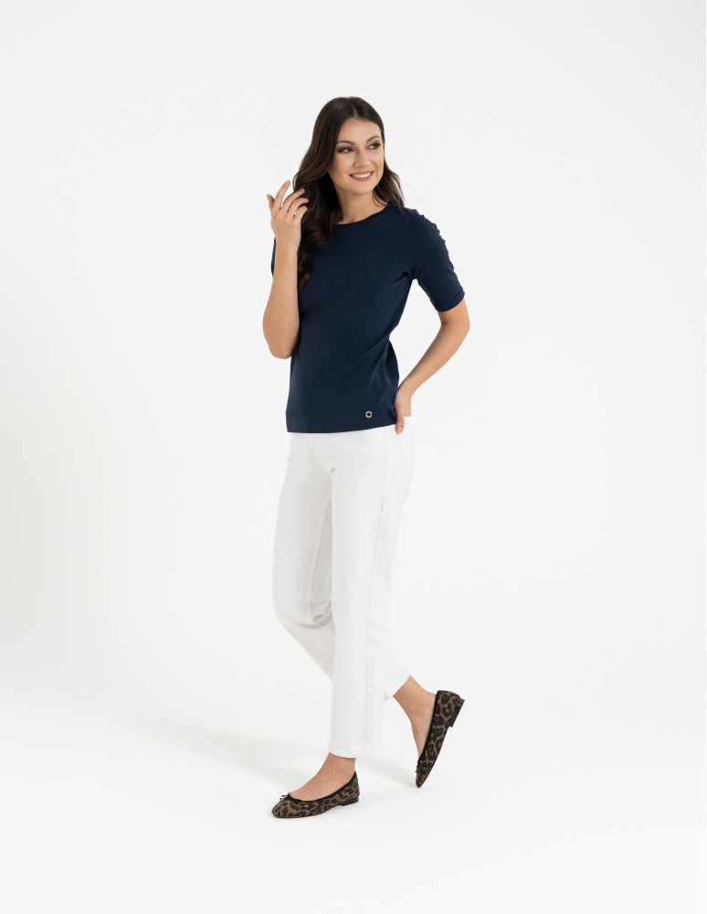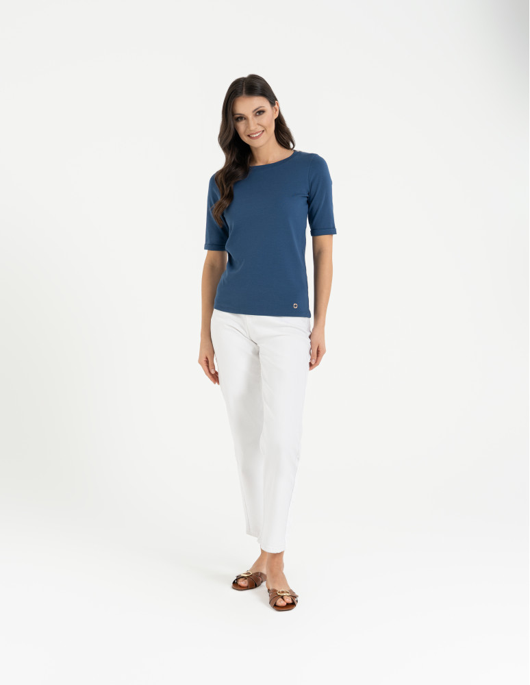 Ta klasyczna bluzka damska to połączenie ponadczasowego stylu i wyjątkowego komfortu. Wykonana z wysokiej jakości bawełny z dodatkiem elastanu, delikatnie dopasowuje się do sylwetki, zapewniając swobodę ruchów i przyjemne uczucie przez cały dzień. Prosty fason z półokrągłym dekoltem podkreśla subtelną kobiecość, a rękawy o długości do łokcia dodają całości nowoczesnego charakteru.