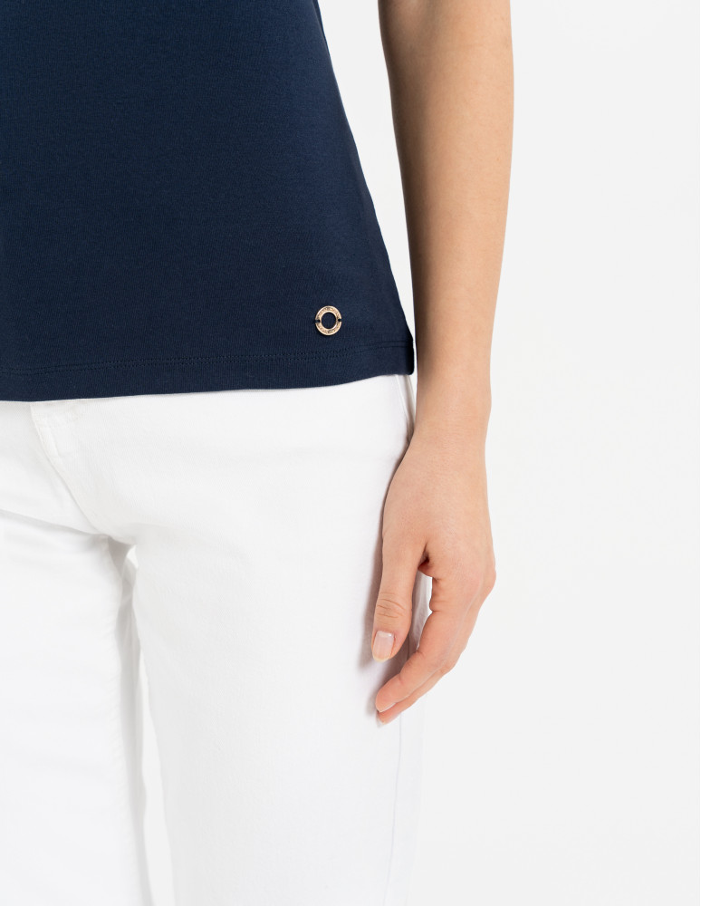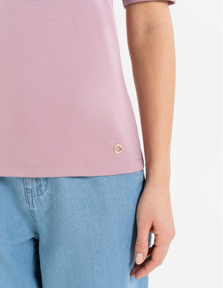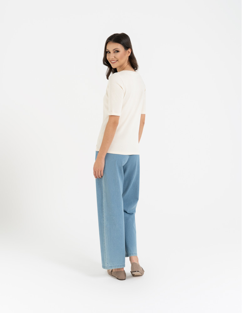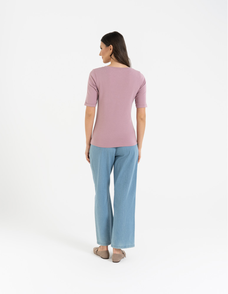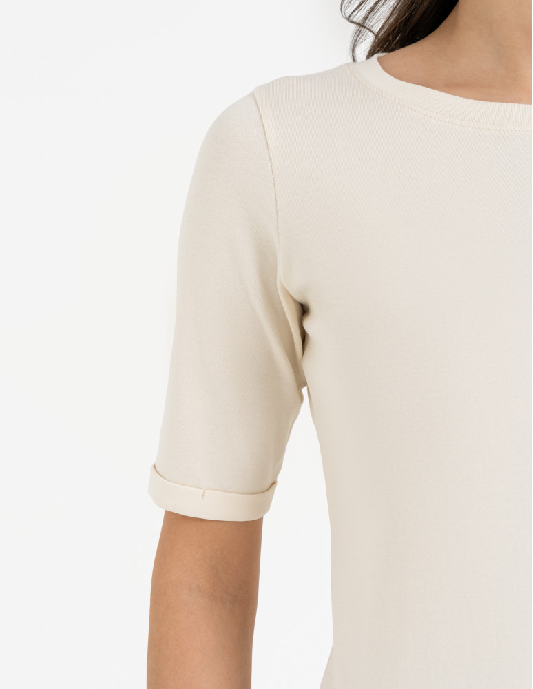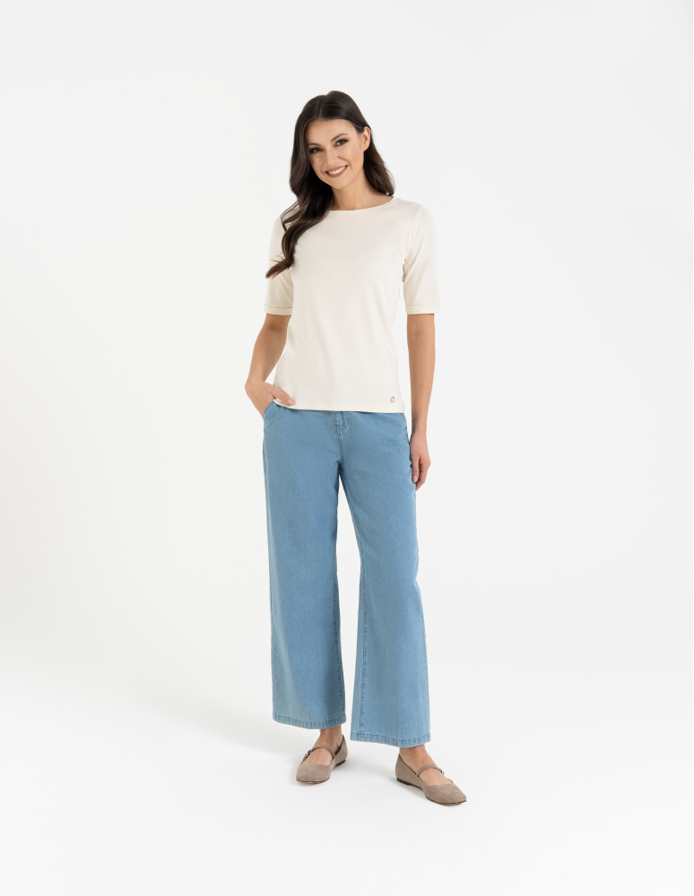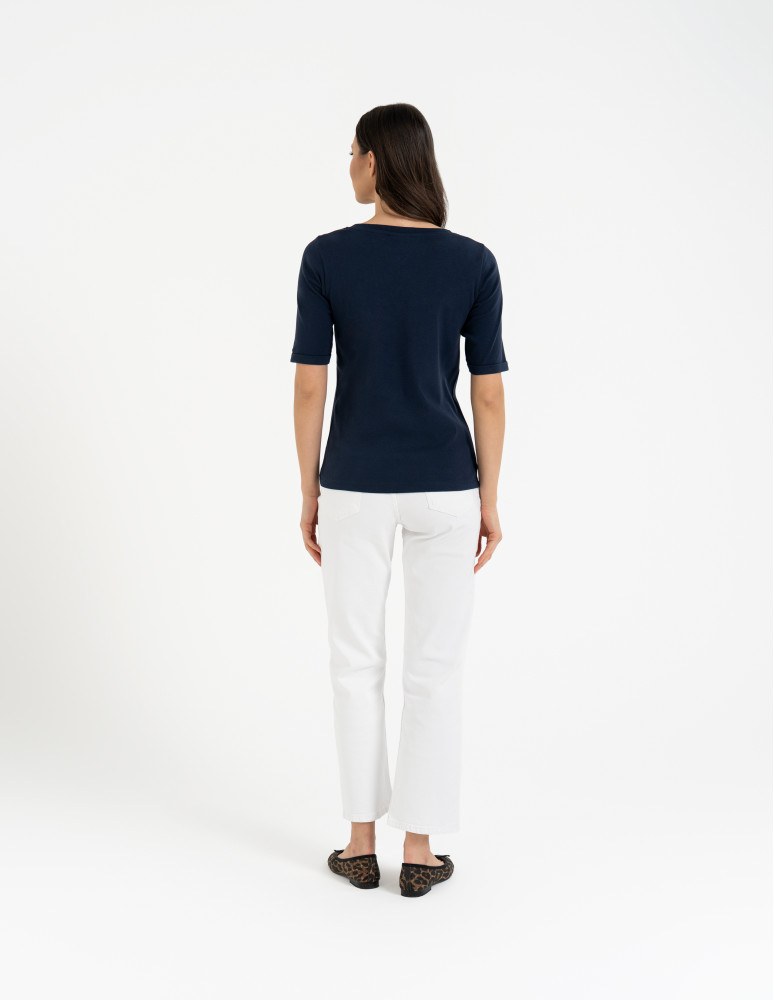 Ta klasyczna bluzka damska to połączenie ponadczasowego stylu i wyjątkowego komfortu. Wykonana z wysokiej jakości bawełny z dodatkiem elastanu, delikatnie dopasowuje się do sylwetki, zapewniając swobodę ruchów i przyjemne uczucie przez cały dzień. Prosty fason z półokrągłym dekoltem podkreśla subtelną kobiecość, a rękawy o długości do łokcia dodają całości nowoczesnego charakteru.