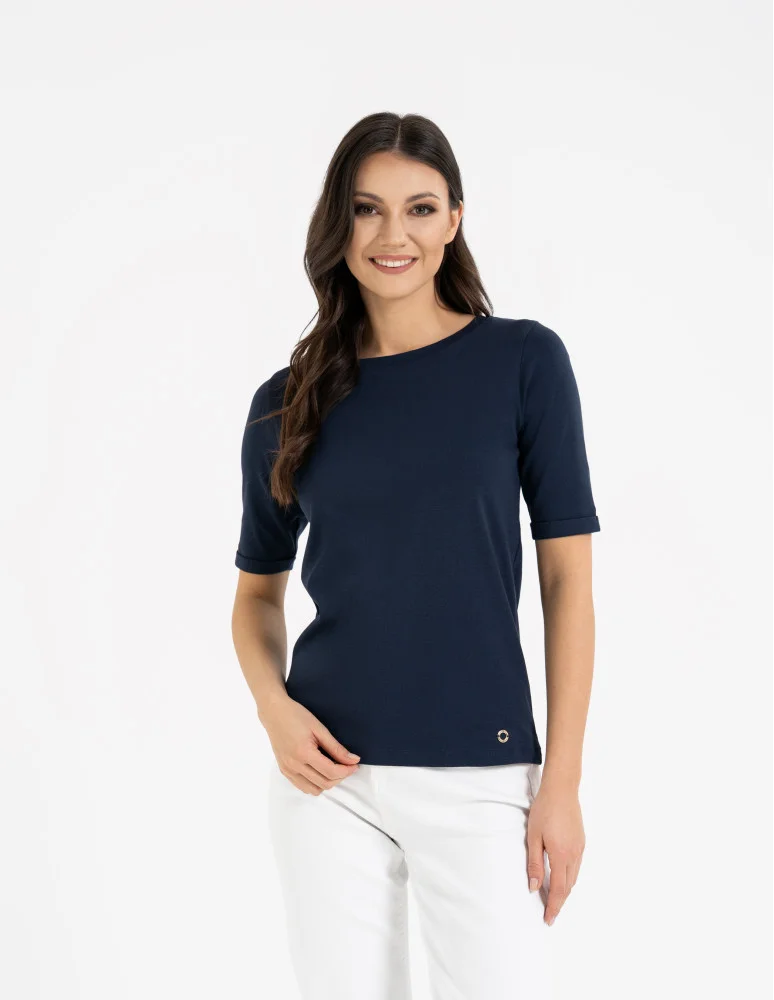 Ta klasyczna bluzka damska to połączenie ponadczasowego stylu i wyjątkowego komfortu. Wykonana z wysokiej jakości bawełny z dodatkiem elastanu, delikatnie dopasowuje się do sylwetki, zapewniając swobodę ruchów i przyjemne uczucie przez cały dzień. Prosty fason z półokrągłym dekoltem podkreśla subtelną kobiecość, a rękawy o długości do łokcia dodają całości nowoczesnego charakteru.