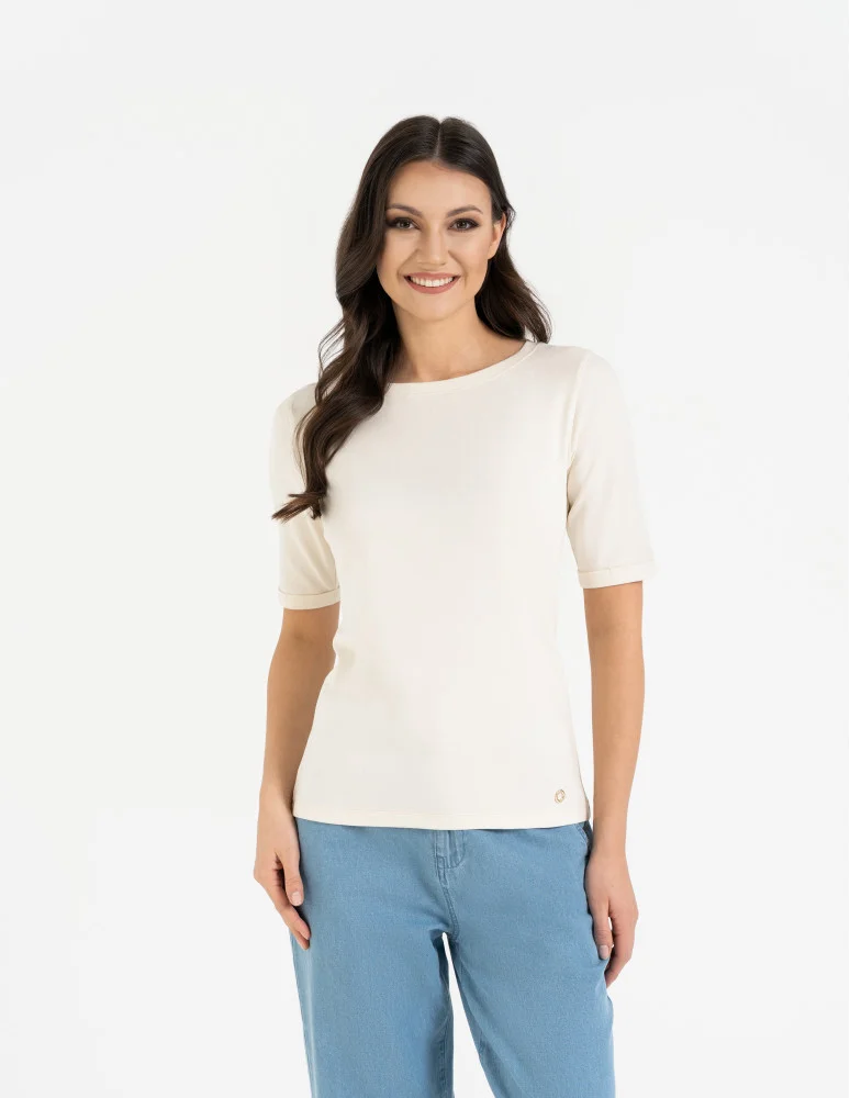 Bluzka damska z krótkim rękawem bawełniana bez wzoru KREMOWY