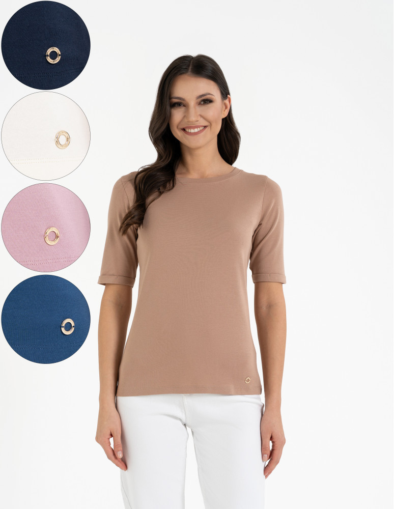 Ta klasyczna bluzka damska to połączenie ponadczasowego stylu i wyjątkowego komfortu. Wykonana z wysokiej jakości bawełny z dodatkiem elastanu, delikatnie dopasowuje się do sylwetki, zapewniając swobodę ruchów i przyjemne uczucie przez cały dzień. Prosty fason z półokrągłym dekoltem podkreśla subtelną kobiecość, a rękawy o długości do łokcia dodają całości nowoczesnego charakteru.