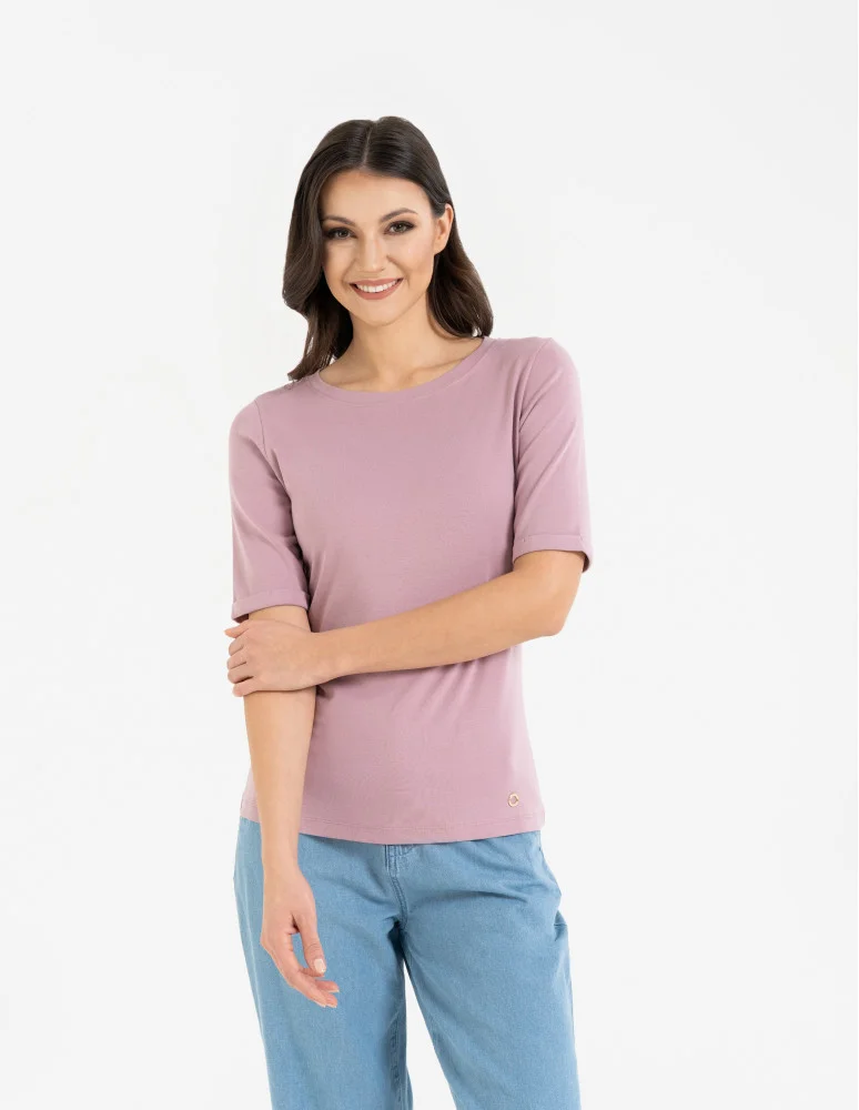 Ta klasyczna bluzka damska to połączenie ponadczasowego stylu i wyjątkowego komfortu. Wykonana z wysokiej jakości bawełny z dodatkiem elastanu, delikatnie dopasowuje się do sylwetki, zapewniając swobodę ruchów i przyjemne uczucie przez cały dzień. Prosty fason z półokrągłym dekoltem podkreśla subtelną kobiecość, a rękawy o długości do łokcia dodają całości nowoczesnego charakteru.