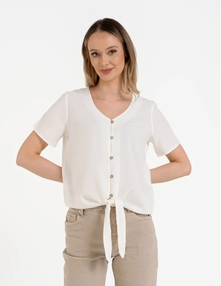 Damska bluzka z wiązaniem z dodatkiem lnu BIAŁY
