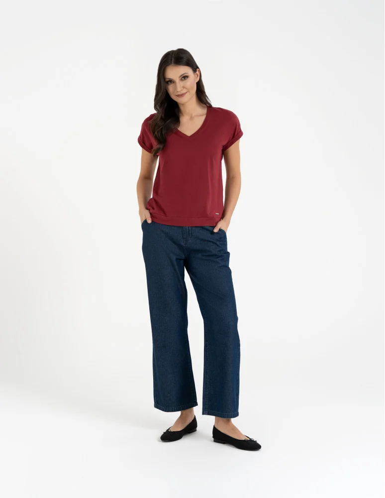 Bawełniana bluzka damska z domieszką modalu i dekoltem V CZERWONY