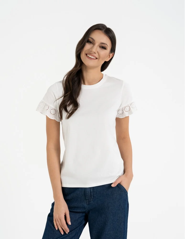 Bluzka damska z krótkim rękawem z koronką bawełniana BIAŁY
