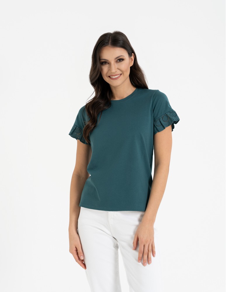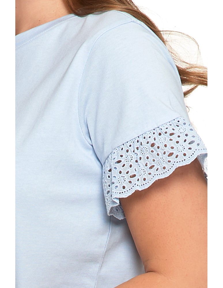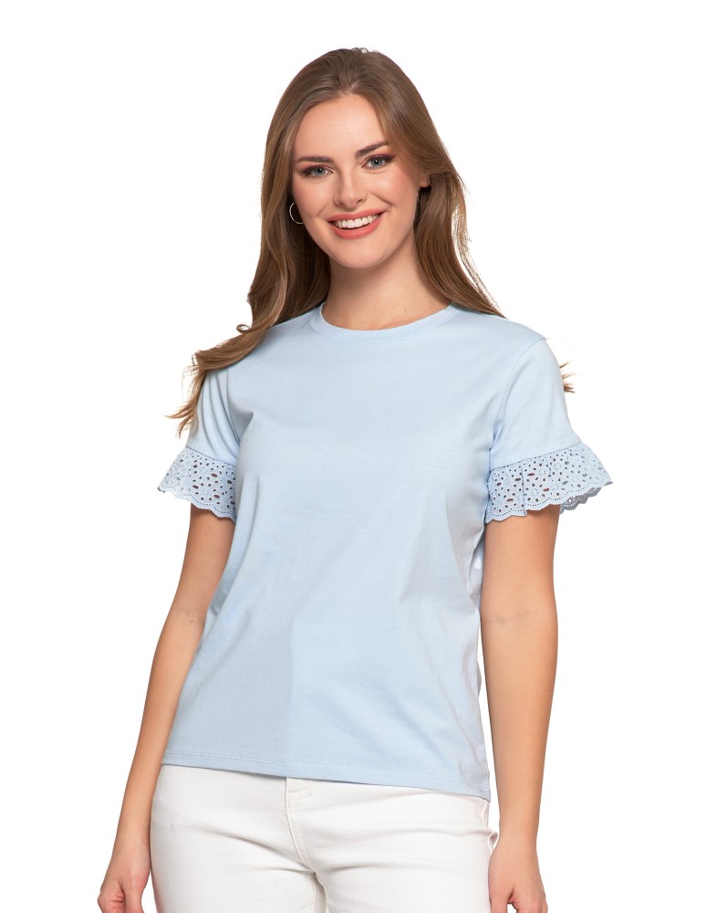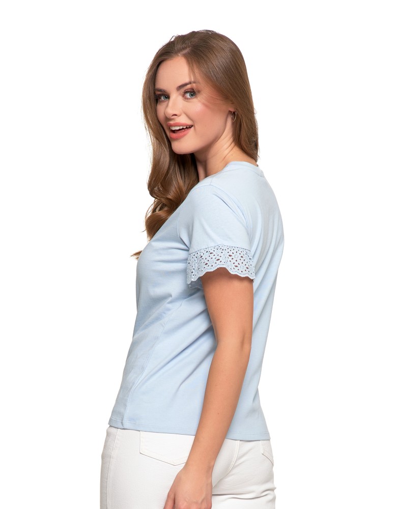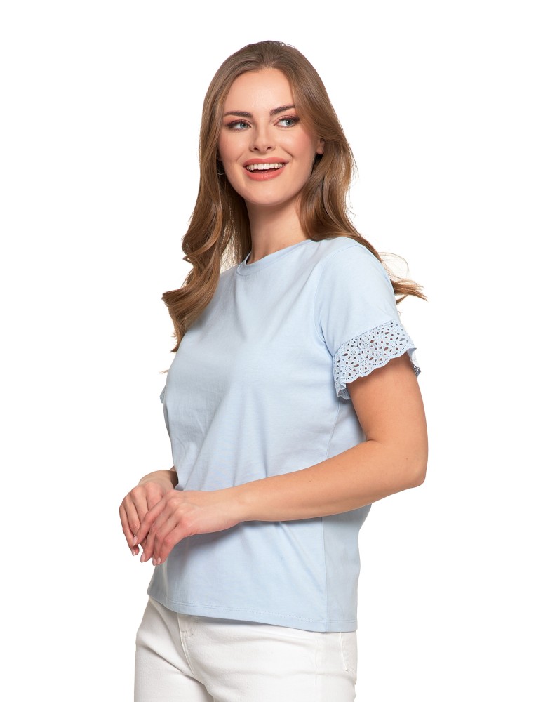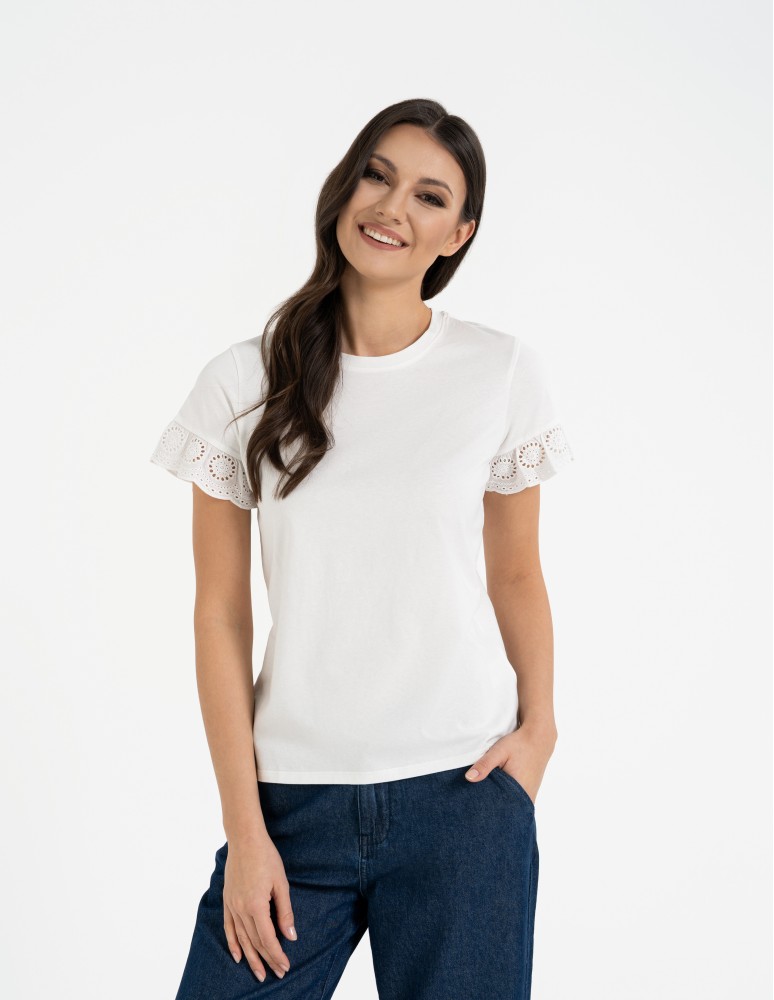 Model posiada klasyczny, okrągły dekolt oraz rękawek wykończony subtelną koronką, która nadaje całości lekkości i romantycznego charakteru. Gładka forma sprawia, że bluzka świetnie komponuje się z jeansami, spódnicą czy eleganckimi spodniami.