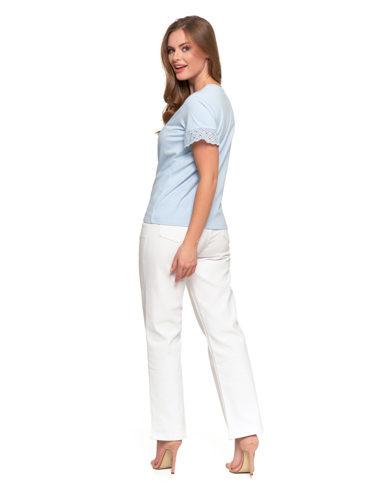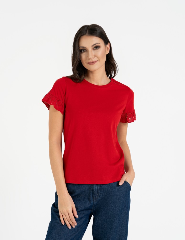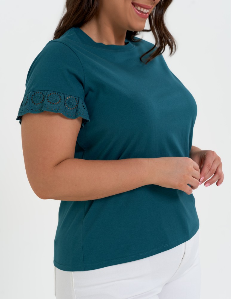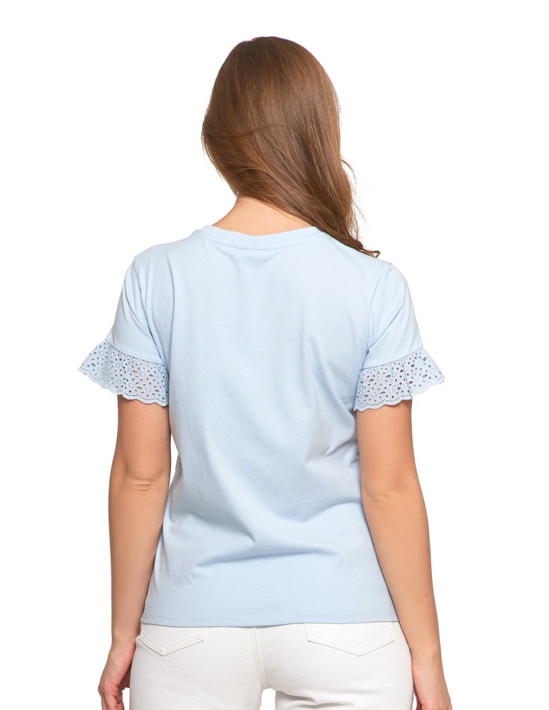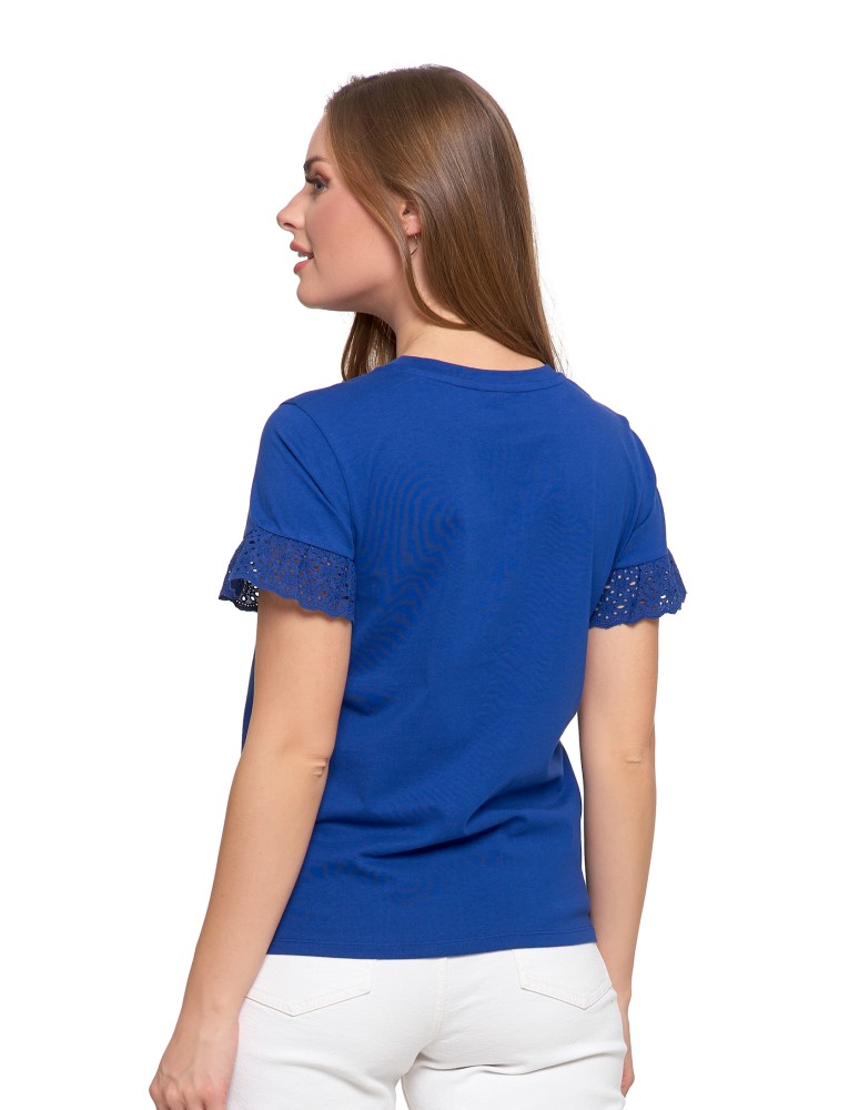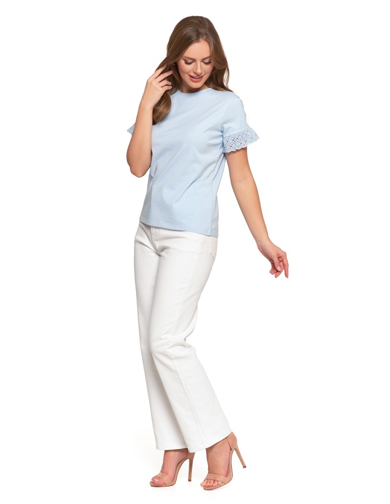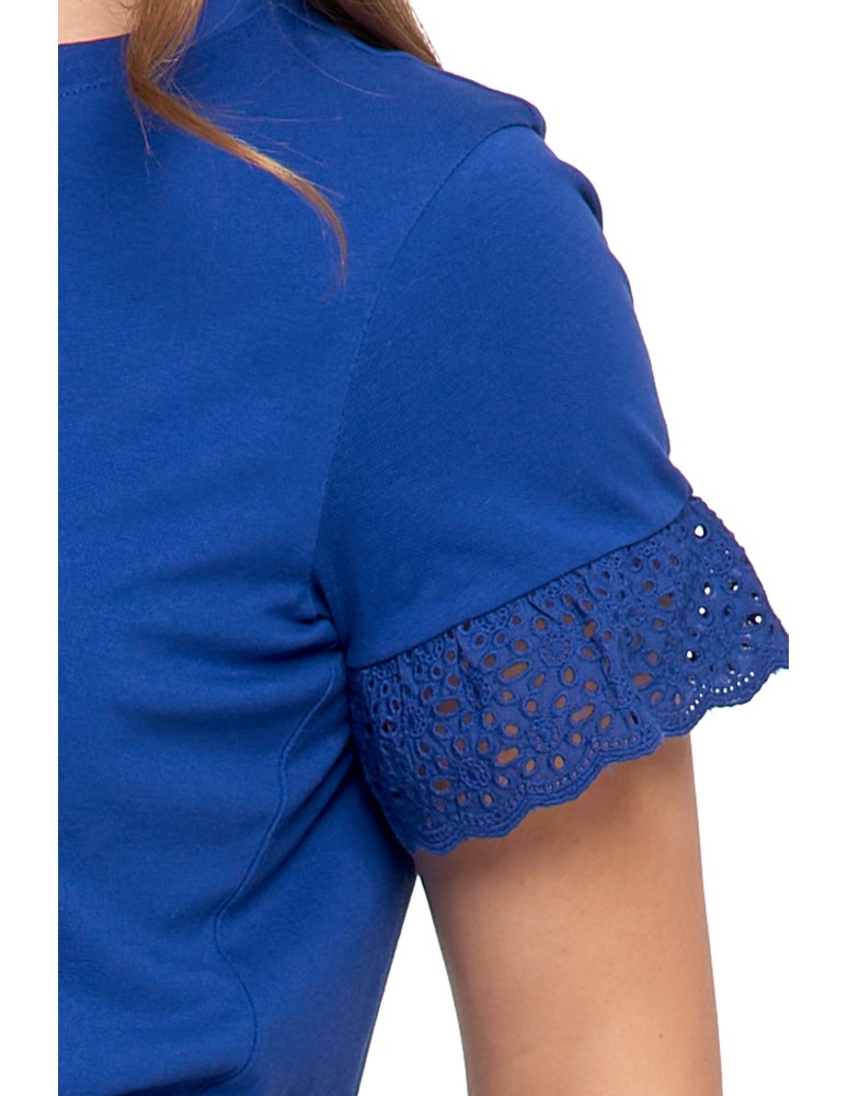 Model posiada klasyczny, okrągły dekolt oraz rękawek wykończony subtelną koronką, która nadaje całości lekkości i romantycznego charakteru. Gładka forma sprawia, że bluzka świetnie komponuje się z jeansami, spódnicą czy eleganckimi spodniami.