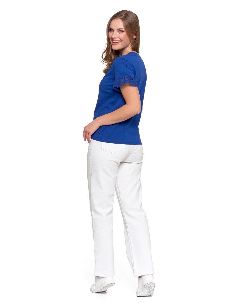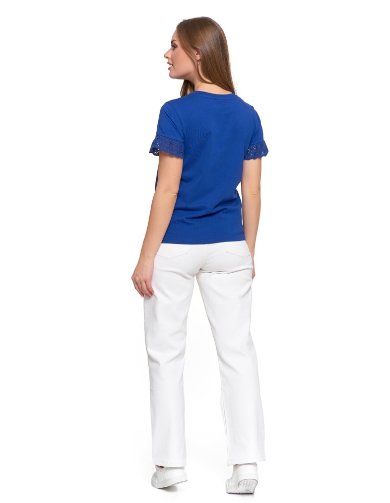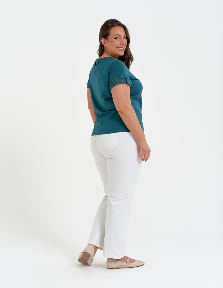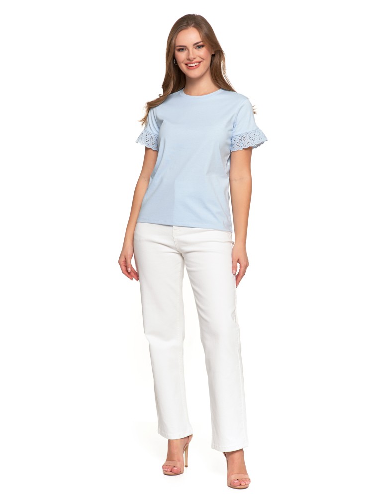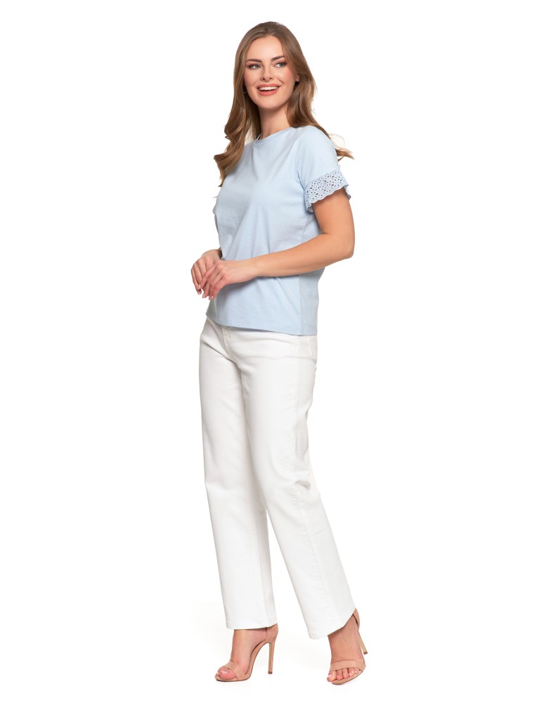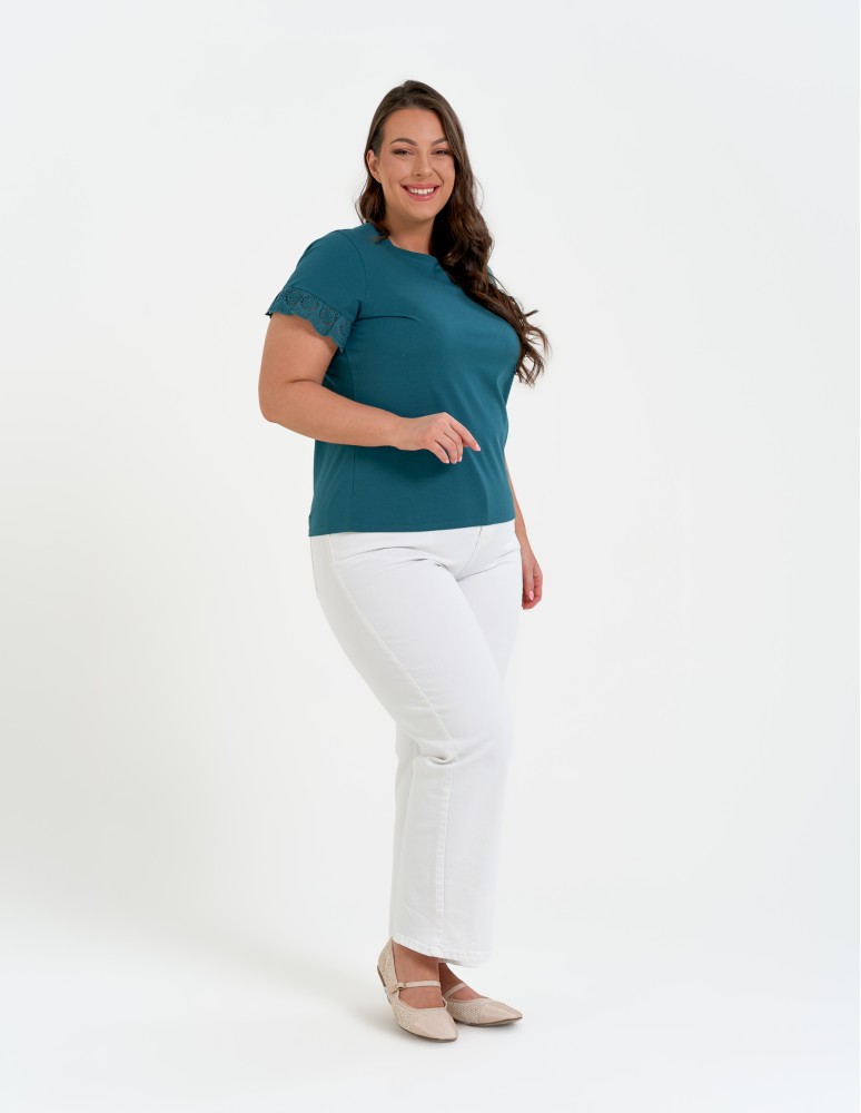 Model posiada klasyczny, okrągły dekolt oraz rękawek wykończony subtelną koronką, która nadaje całości lekkości i romantycznego charakteru. Gładka forma sprawia, że bluzka świetnie komponuje się z jeansami, spódnicą czy eleganckimi spodniami.