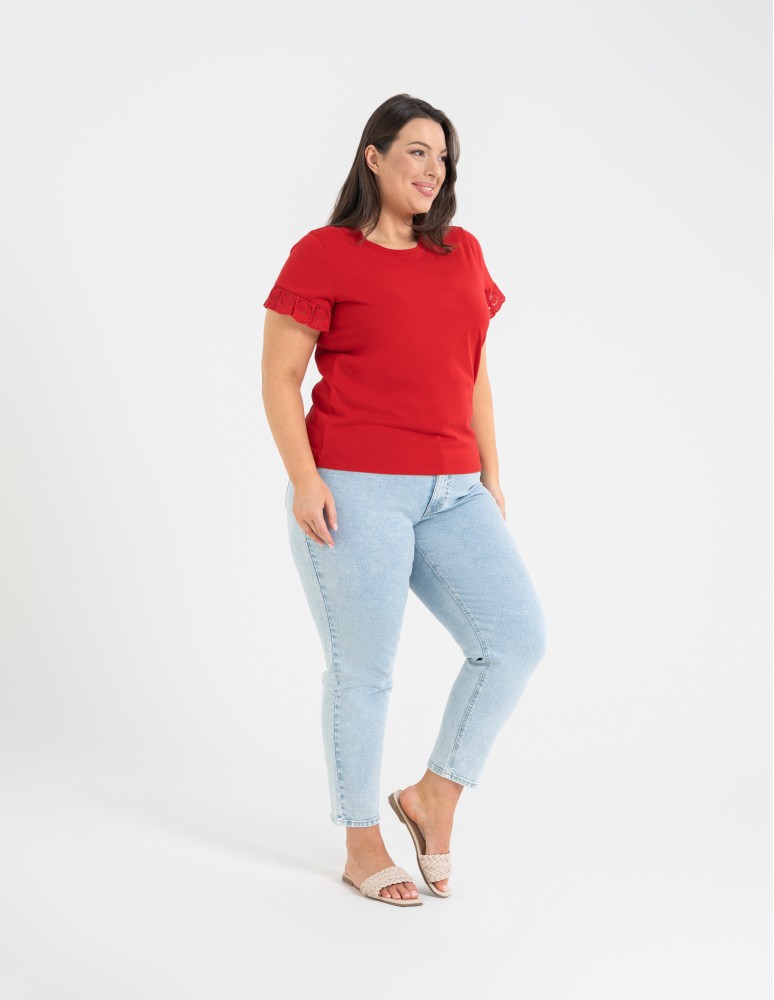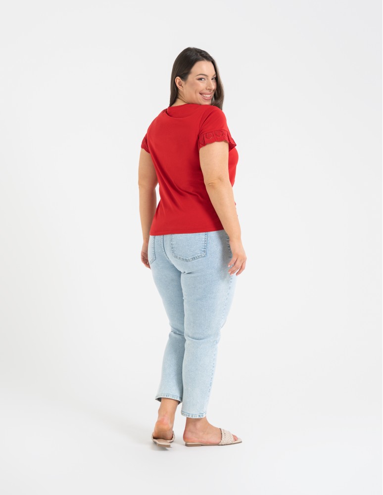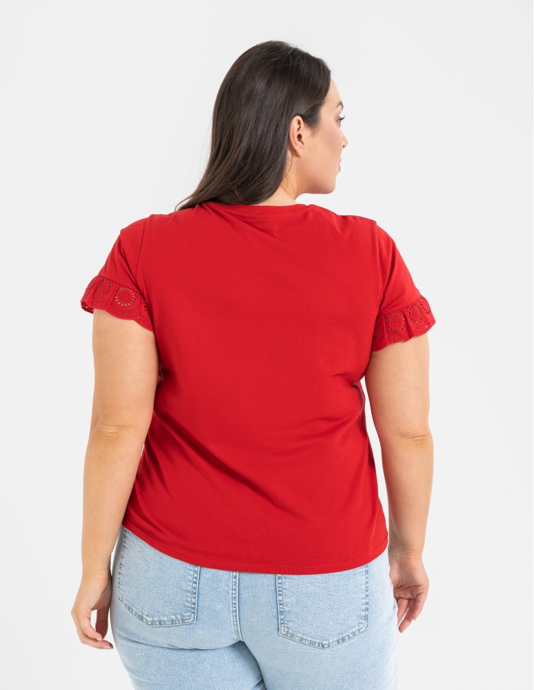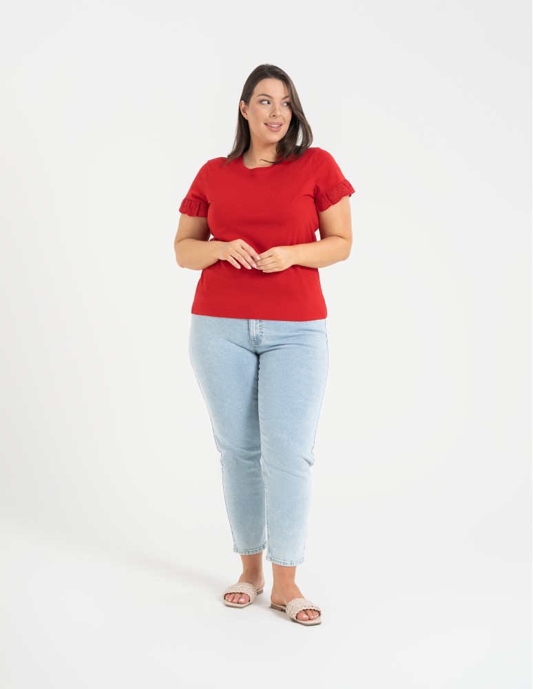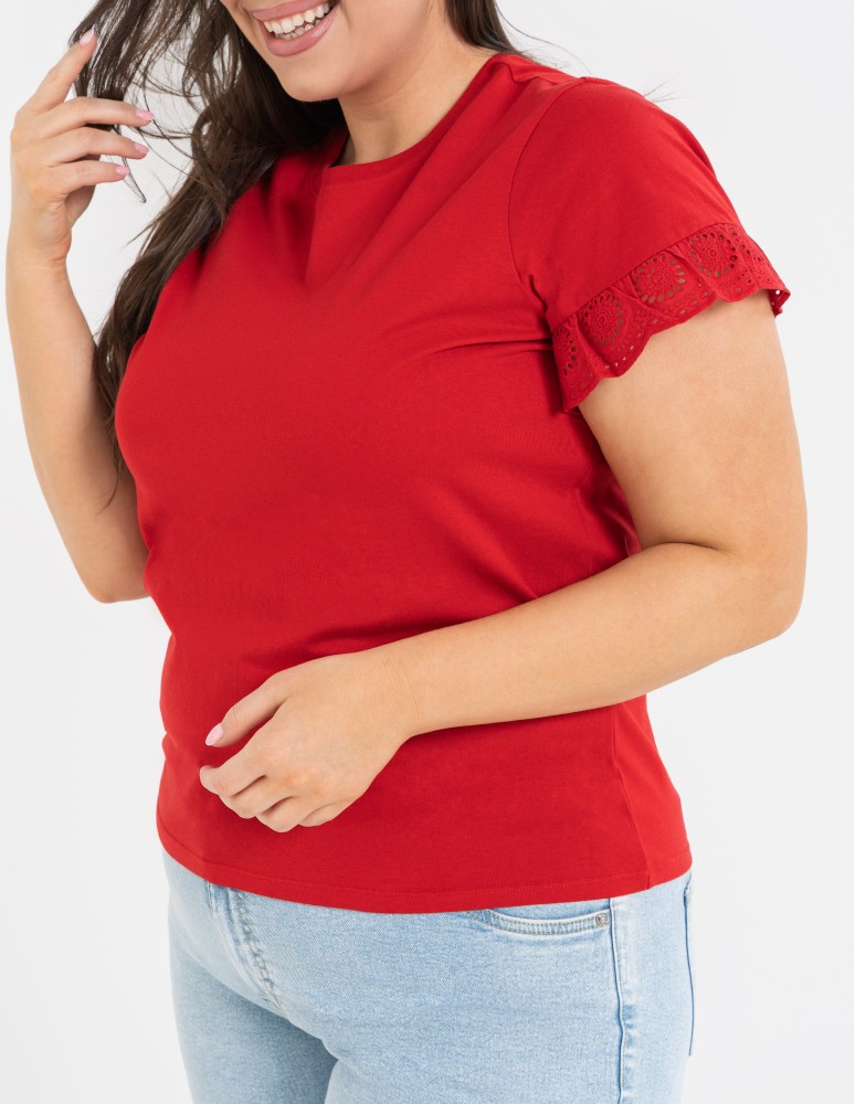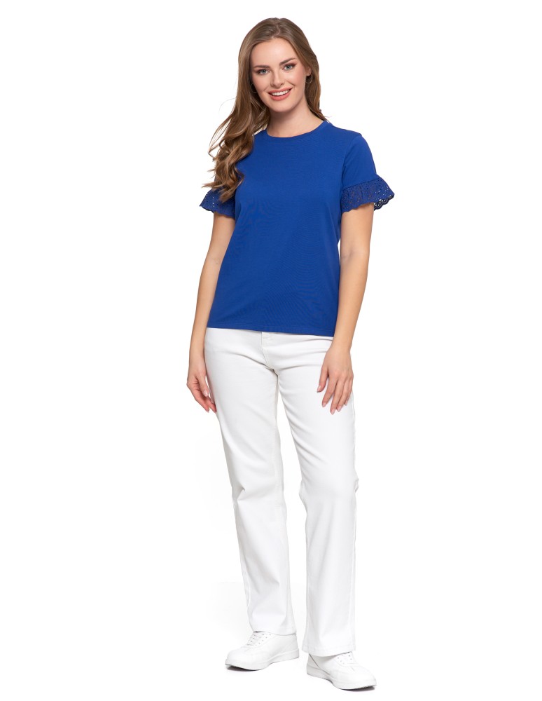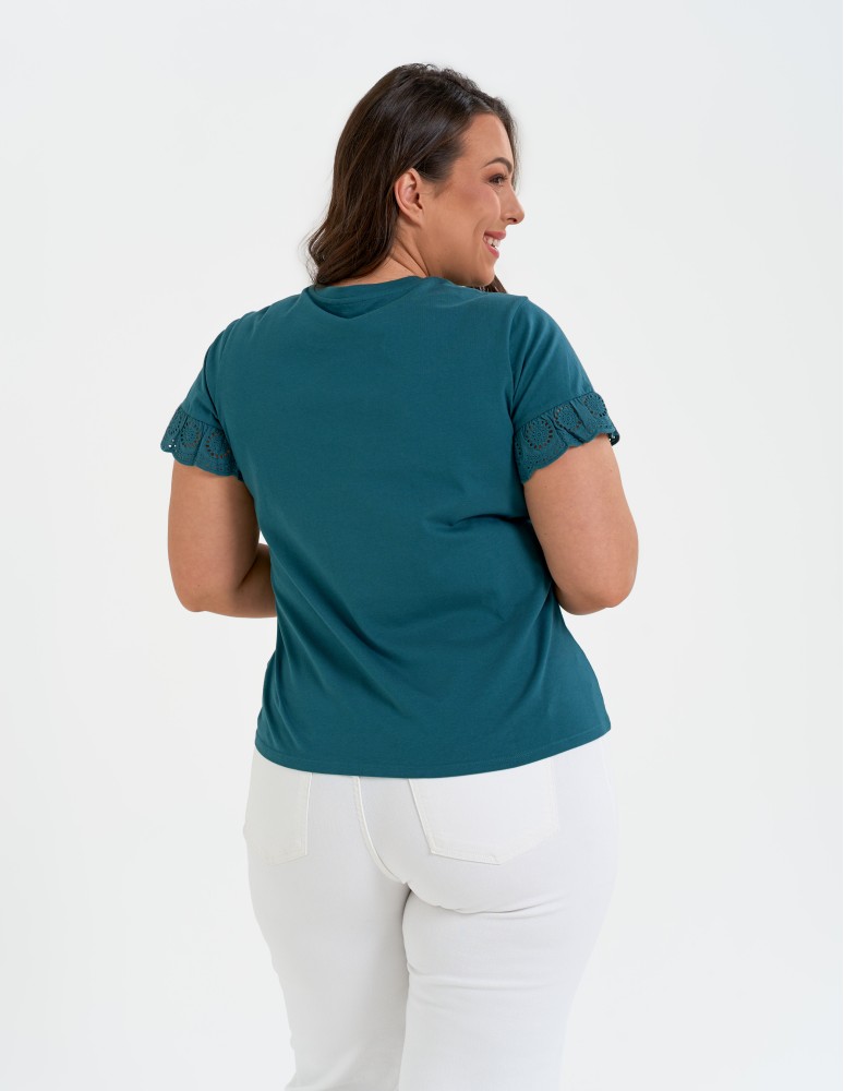 Model posiada klasyczny, okrągły dekolt oraz rękawek wykończony subtelną koronką, która nadaje całości lekkości i romantycznego charakteru. Gładka forma sprawia, że bluzka świetnie komponuje się z jeansami, spódnicą czy eleganckimi spodniami.