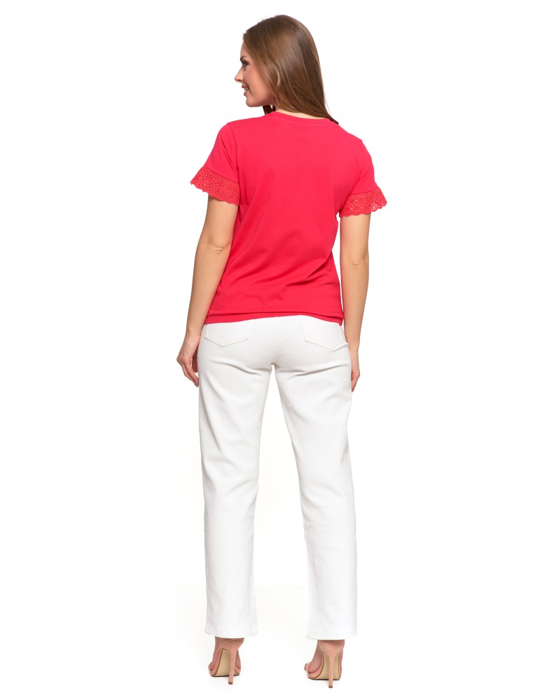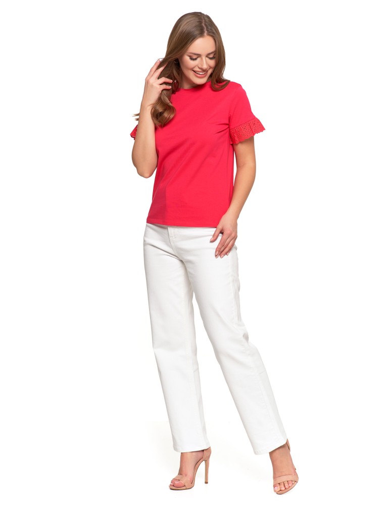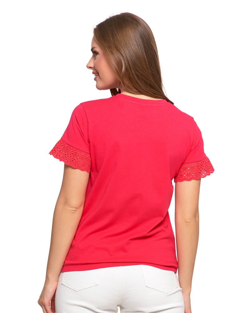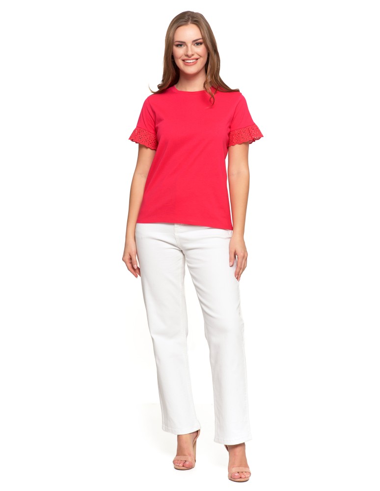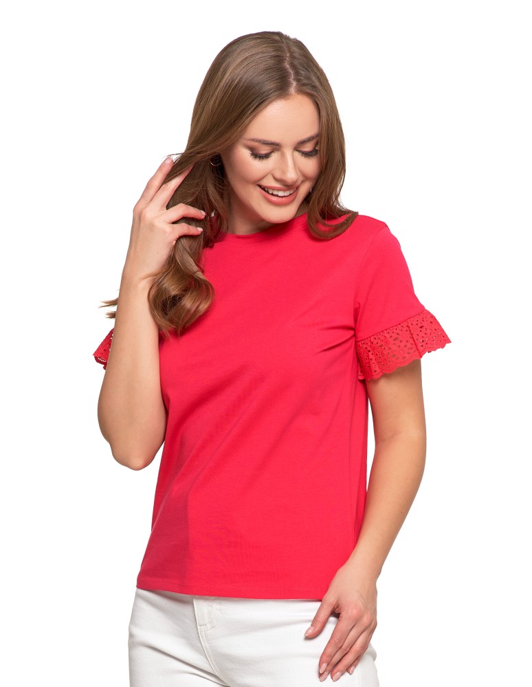 Bluzka damska z krótkim rękawem z koronką bawełniana FUKSJA