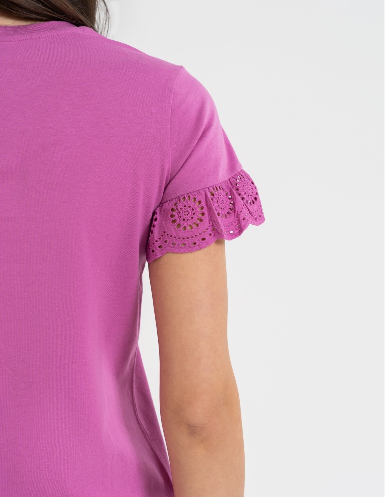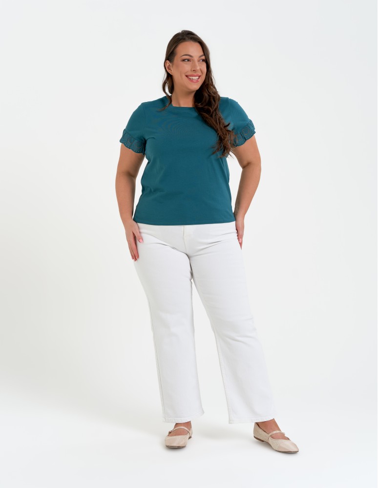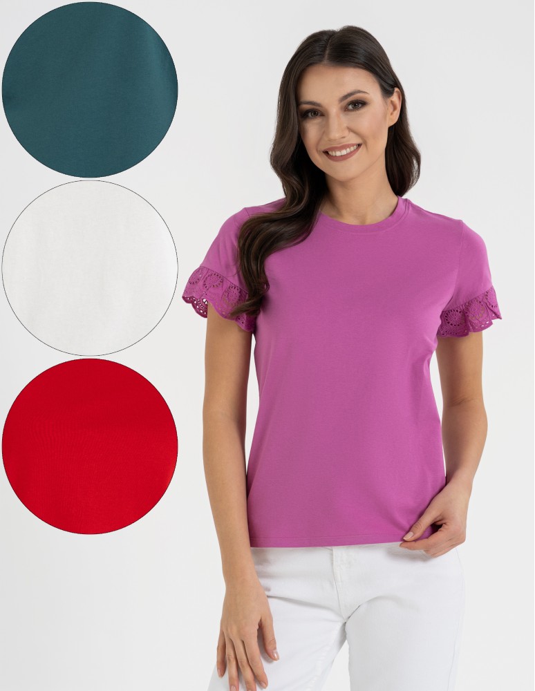 Model posiada klasyczny, okrągły dekolt oraz rękawek wykończony subtelną koronką, która nadaje całości lekkości i romantycznego charakteru. Gładka forma sprawia, że bluzka świetnie komponuje się z jeansami, spódnicą czy eleganckimi spodniami.