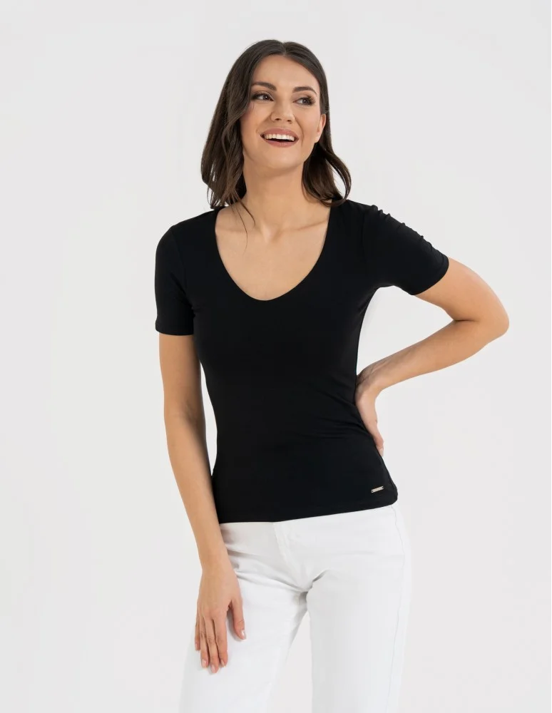 Bluzka damska z dekoltem w serek wiskozowa bez wzoru CZARNY