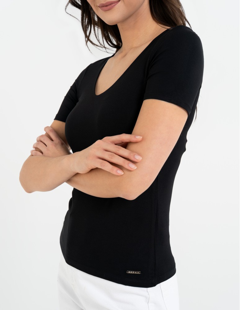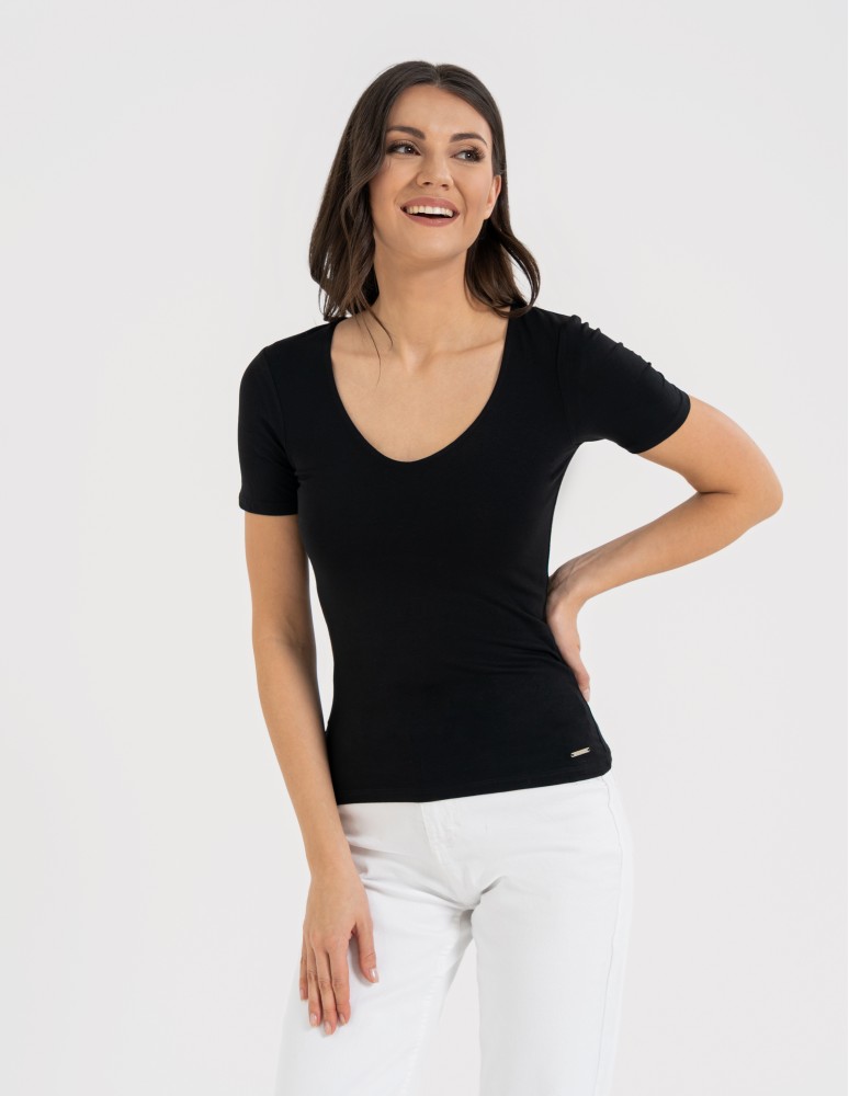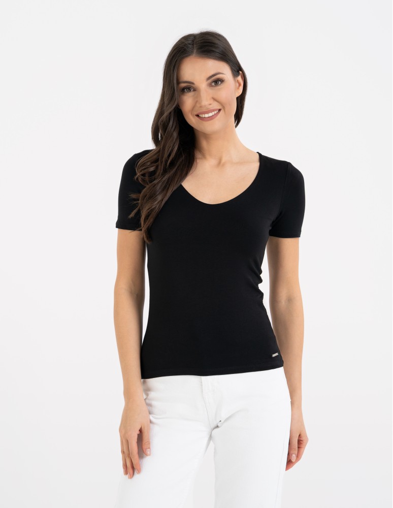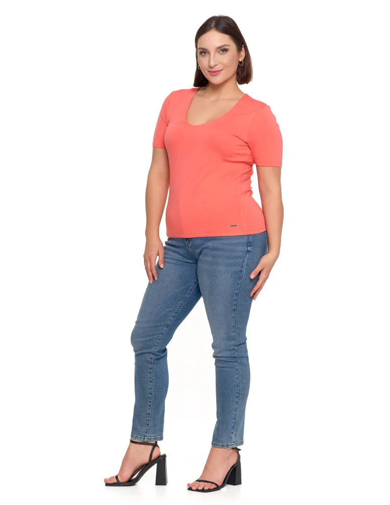 Bluzka damska z dekoltem w serek wiskozowa bez wzoru POMARAŃCZOWY