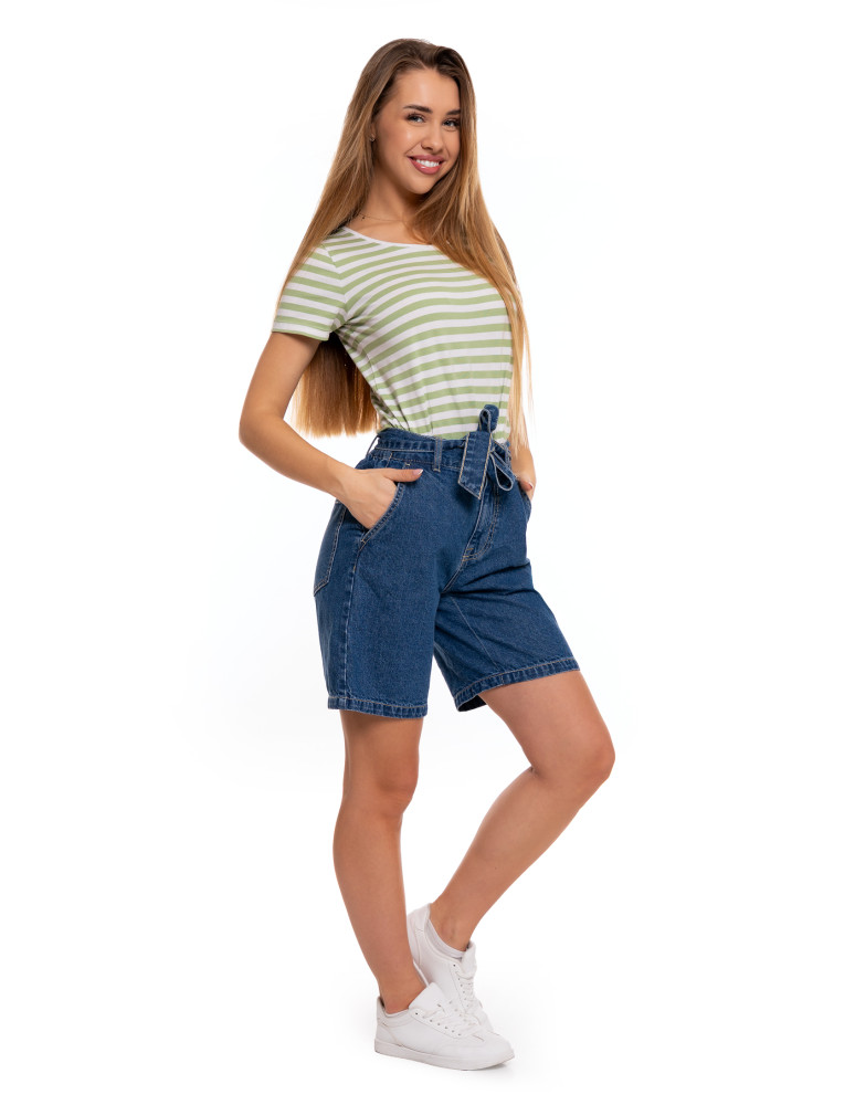 Damskie jeansowe szorty z wysokim stanem i paskiem CIEMNY NIEBIESKI