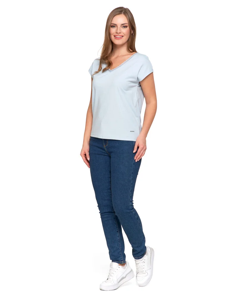 Bluzka damska bawełniana z koronkowym dekoltem NIEBIESKI