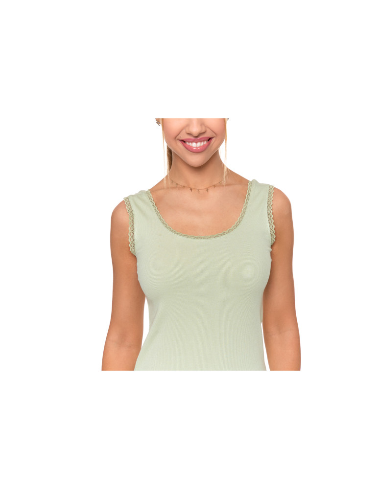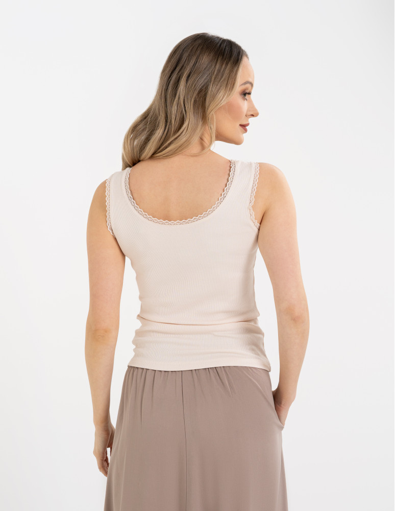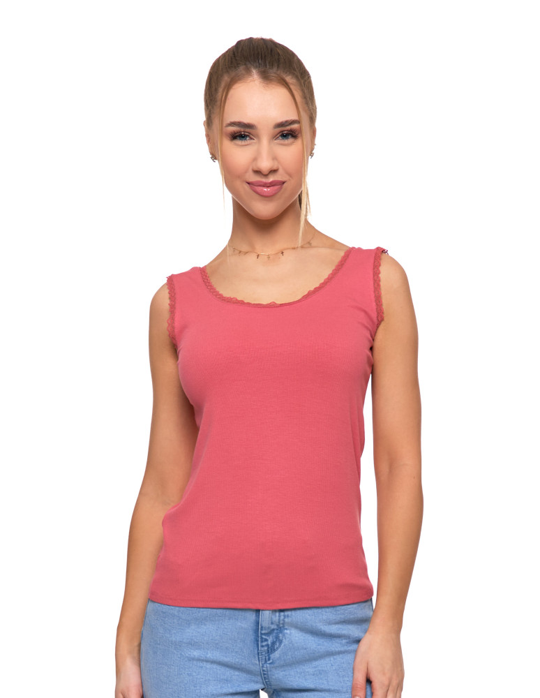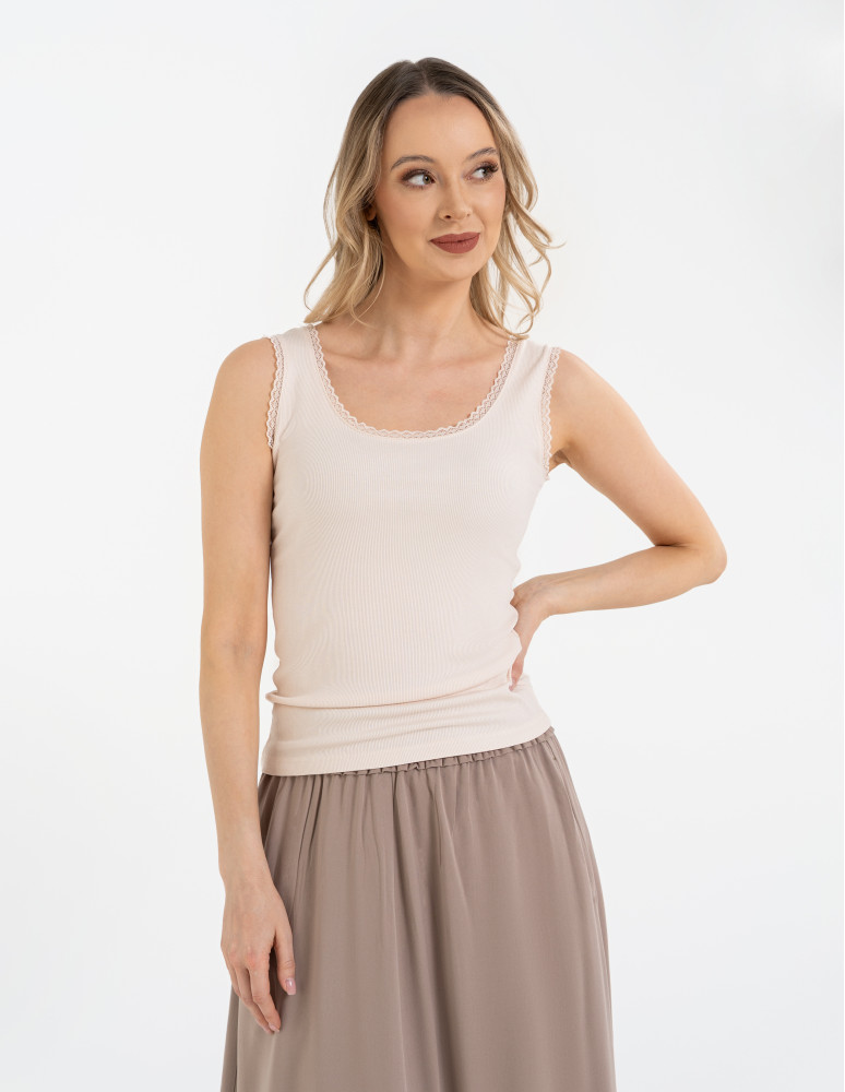Elastyczna dzianina prążkowana delikatnie podkreśla figurę, a bardziej wycięty dekolt oraz ramiączka wykończone subtelną, miękką koronką dodają całości elegancji i lekko zmysłowego charakteru. Model świetnie sprawdzi się zarówno jako element bielizny dziennej, jak i baza do codziennych stylizacji lub wygodna koszulka do spania.