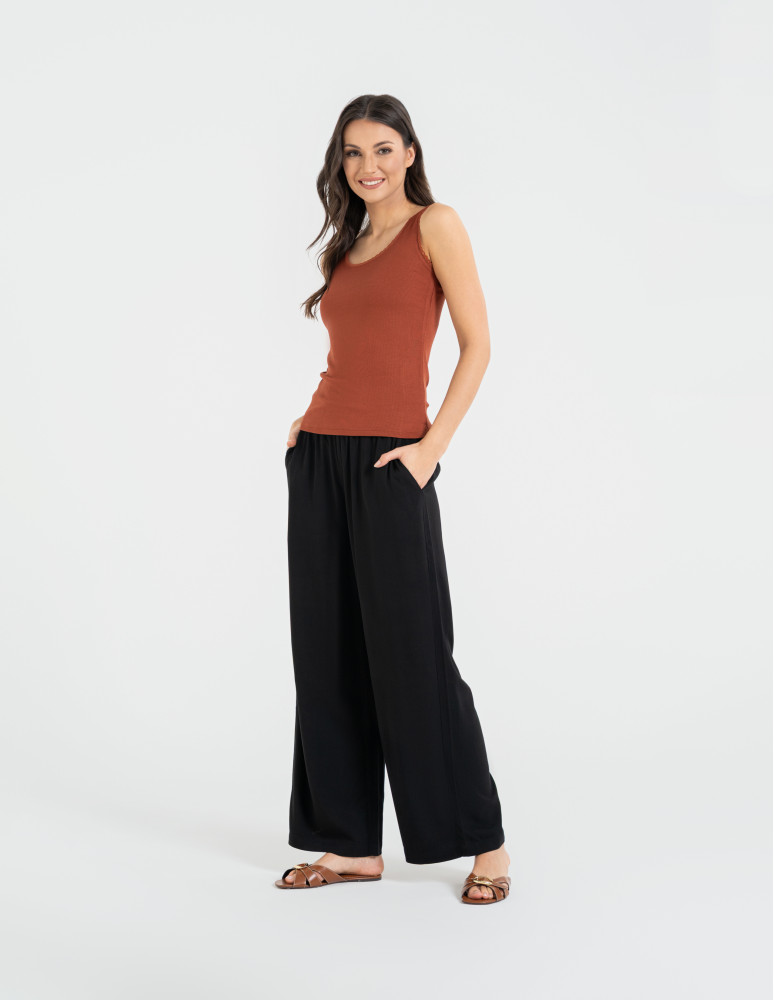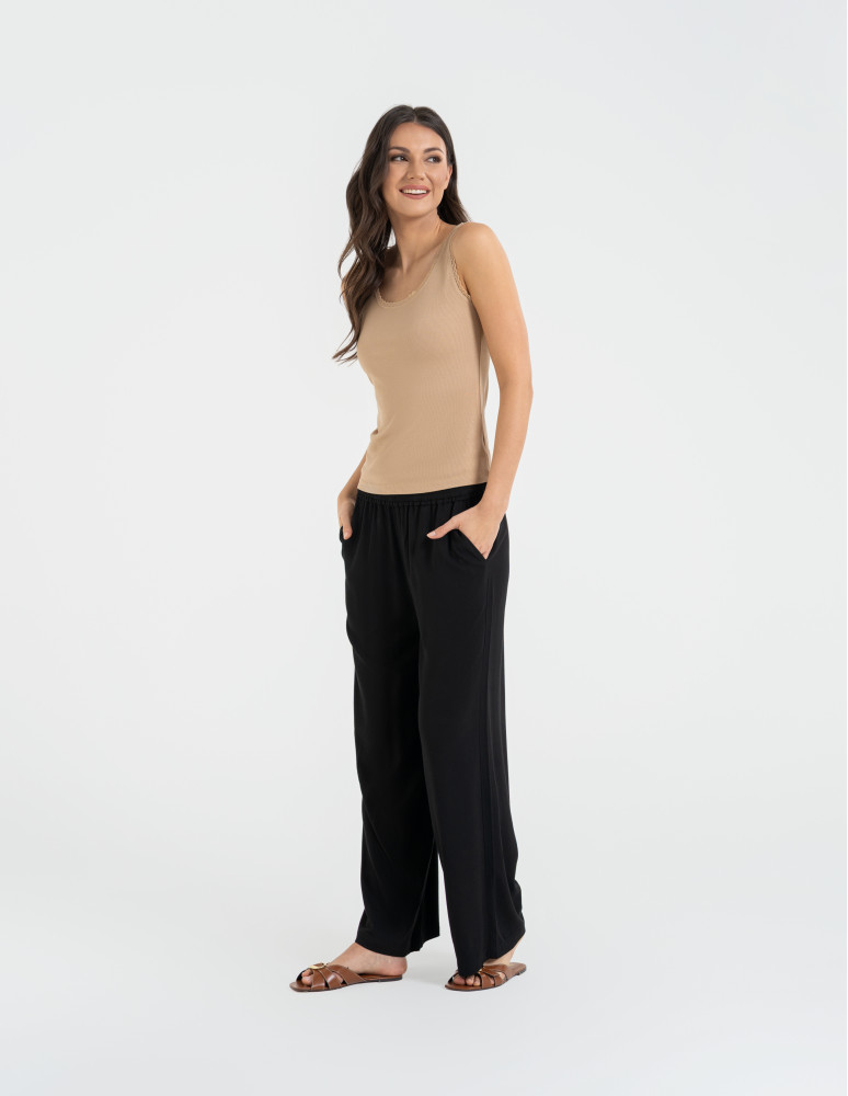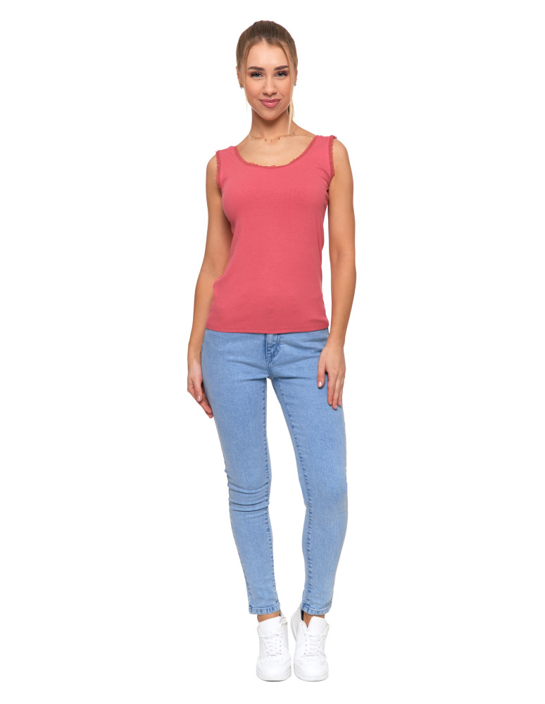Komfortowa damska koszulka bez rękawów typu tank top, zaprojektowana z myślą o codziennej wygodzie i kobiecym wykończeniu. Wykonana z wysokiej jakości wiskozy z dodatkiem elastanu, która zapewnia miękkość, lekkość oraz doskonałe dopasowanie do sylwetki.