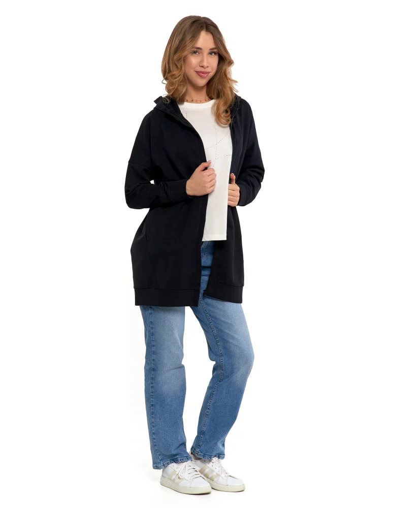 Bluza damska dresowa długa z kapturem i zamkiem CZARNY