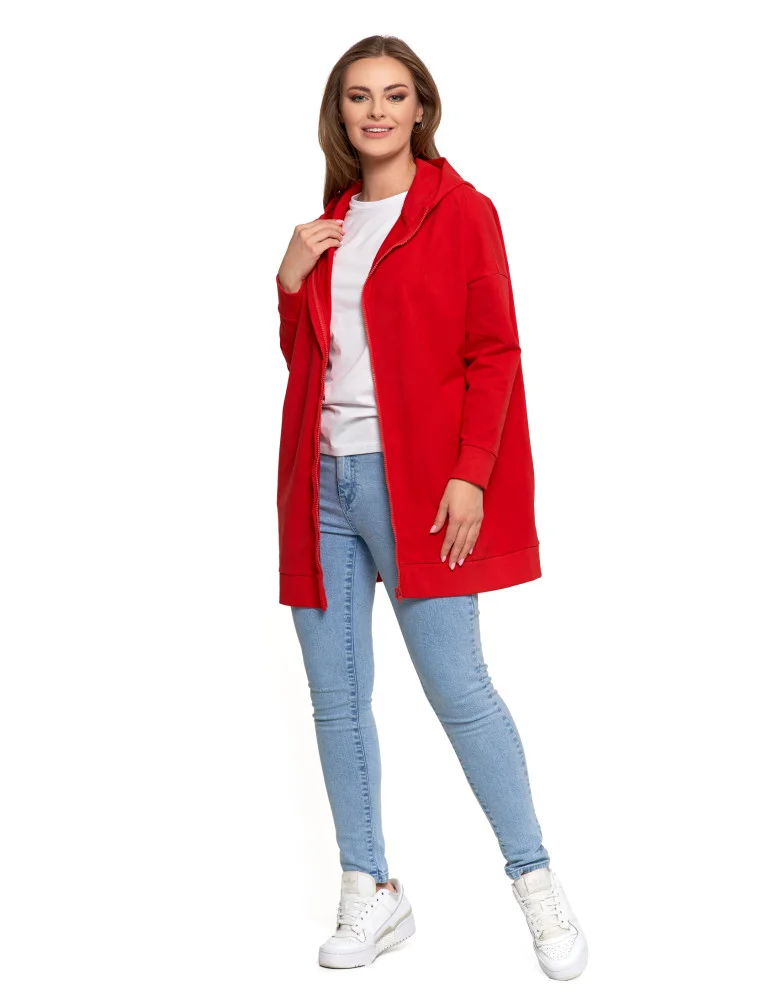 Bluza damska dresowa długa z kapturem i zamkiem CZERWONY