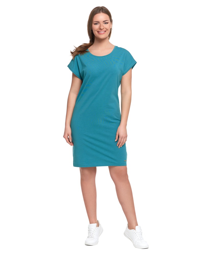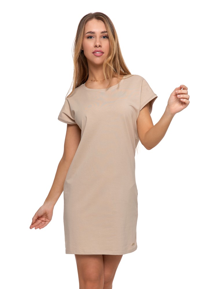 Jeśli szukasz sukienki, która łączy komfort, prostotę i subtelny akcent modowy, ten model jest właśnie dla Ciebie. Sukienka damska z krótkim rękawem i luźnym krojem to idealna propozycja na co dzień. Wykonana z miękkiej bawełny z dodatkiem elastanu, zapewnia pełną swobodę ruchów i wygodę noszenia przez cały dzień. Klasyczny, zaokrąglony dekolt z przodu kontrastuje z efektownym wycięciem w kształcie litery V na plecach, które zdobią dwa dekoracyjne paski. To detal, który dodaje charakteru i wyróżnia sukienkę spośród innych codziennych modeli. Długość przed kolano oraz prosty fason sprawiają, że sukienka sprawdzi się zarówno w domowym zaciszu, jak i podczas spaceru czy spotkania z przyjaciółmi. To doskonały wybór na lato i wiosnę, wystarczy dobrać odpowiednie dodatki.