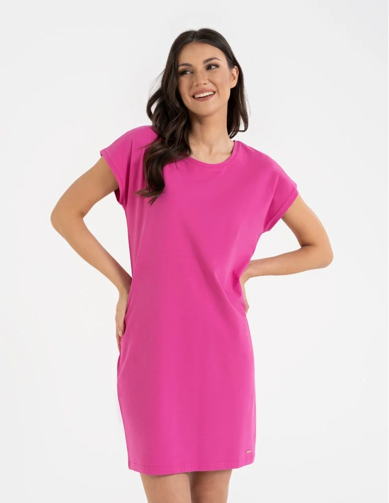 Jeśli szukasz sukienki, która łączy komfort, prostotę i subtelny akcent modowy, ten model jest właśnie dla Ciebie. Sukienka damska z krótkim rękawem i luźnym krojem to idealna propozycja na co dzień. Wykonana z miękkiej bawełny z dodatkiem elastanu, zapewnia pełną swobodę ruchów i wygodę noszenia przez cały dzień. Klasyczny, zaokrąglony dekolt z przodu kontrastuje z efektownym wycięciem w kształcie litery V na plecach, które zdobią dwa dekoracyjne paski. To detal, który dodaje charakteru i wyróżnia sukienkę spośród innych codziennych modeli. Długość przed kolano oraz prosty fason sprawiają, że sukienka sprawdzi się zarówno w domowym zaciszu, jak i podczas spaceru czy spotkania z przyjaciółmi. To doskonały wybór na lato i wiosnę, wystarczy dobrać odpowiednie dodatki.